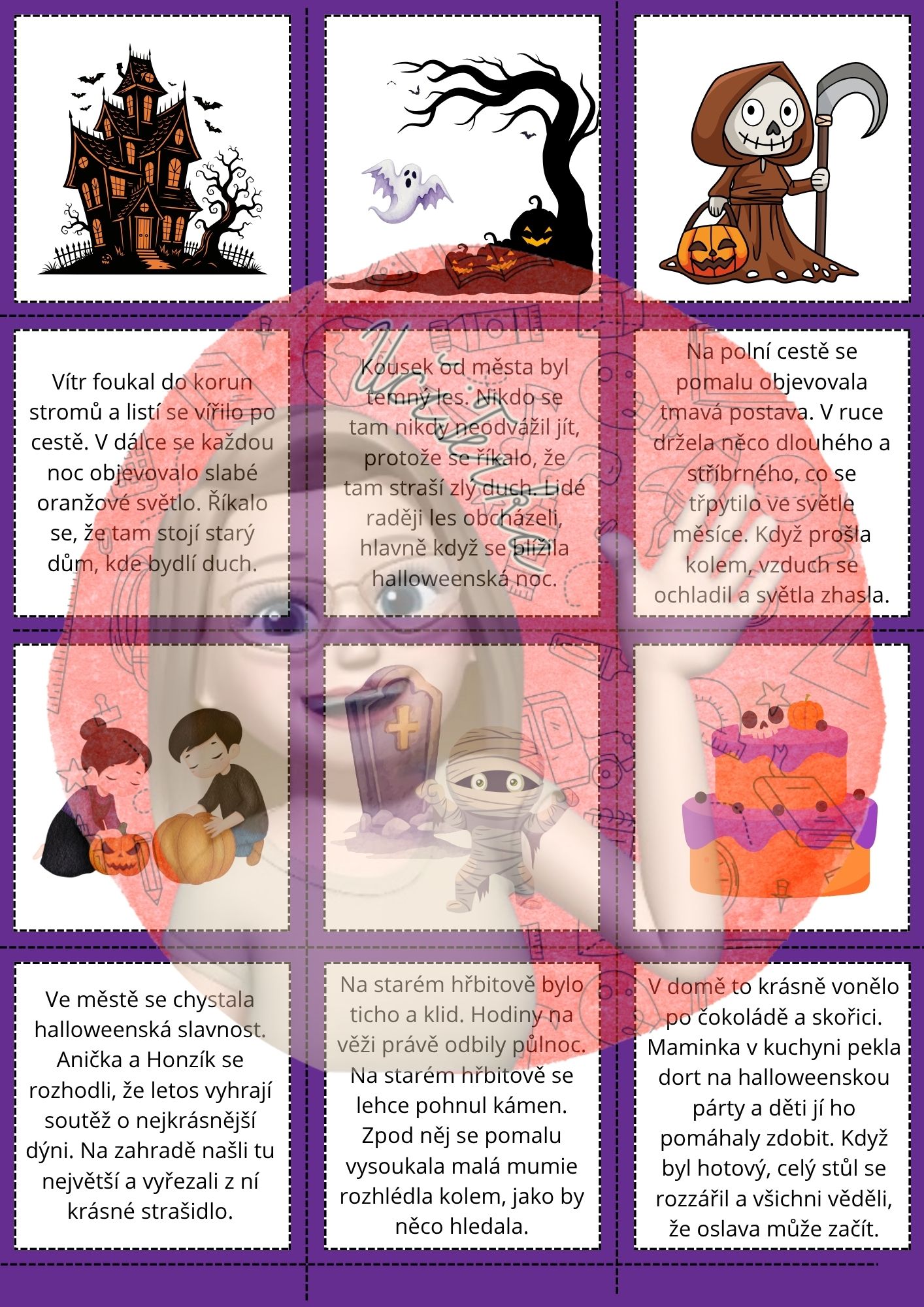 Krátké halloweenské příběhy, ke kterým žáci přiřazují správné obrázky. Aktivita podporuje čtení s porozuměním a pozornost.