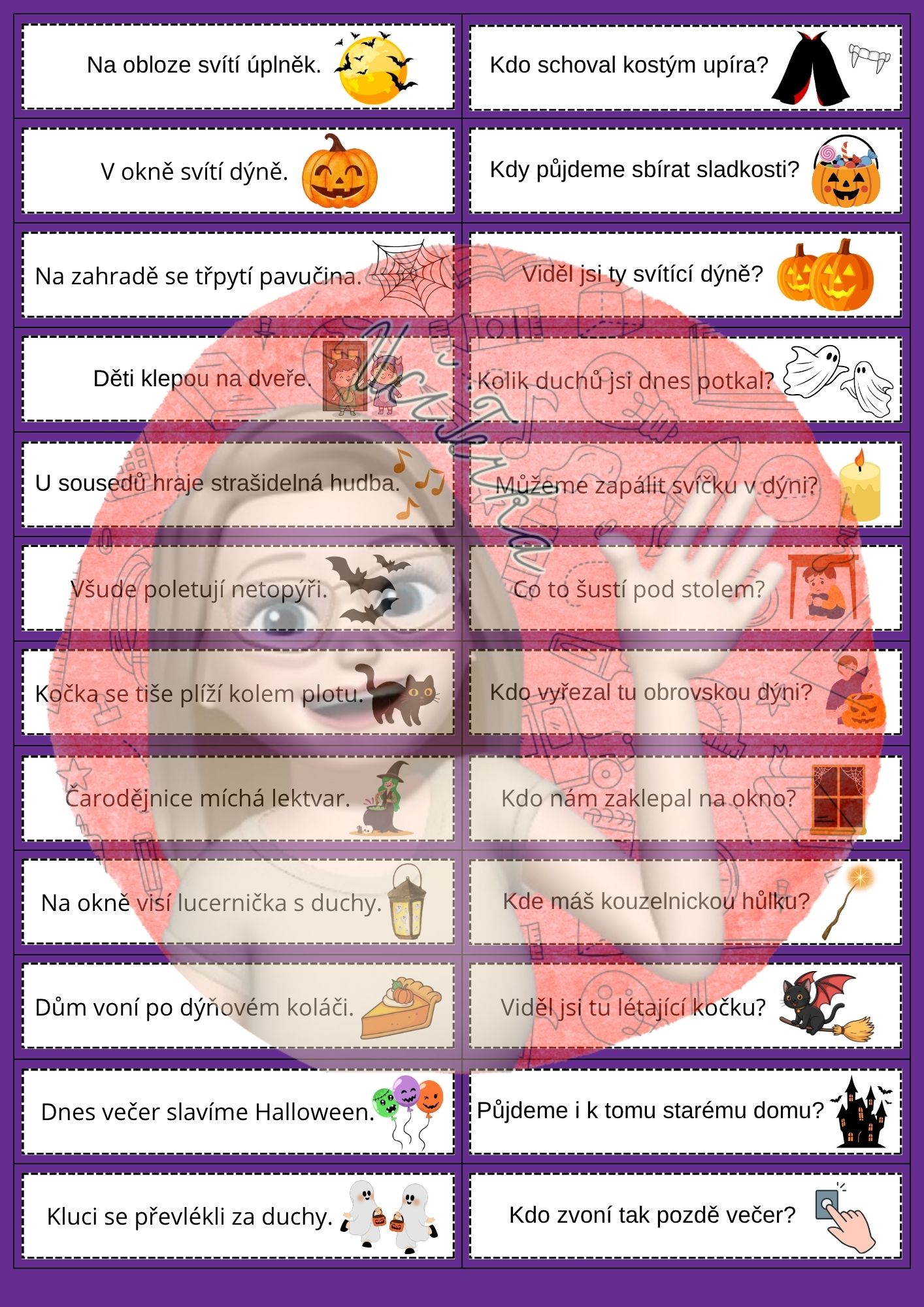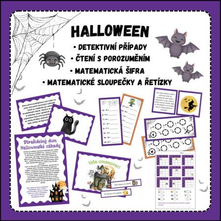 Tento soubor halloweenských aktivit je určen pro žáky 2. třídy a propojuje zábavnou halloweenskou tematiku s procvičováním českého jazyka a matematiky. Český jazyk – čtení s porozuměním, detektivní záhady, rozpoznávání druhů vět (oznamovacích, tázacích, přacích a rozkazovacích). Matematika – sčítání a odčítání do 20, matematická šifra.