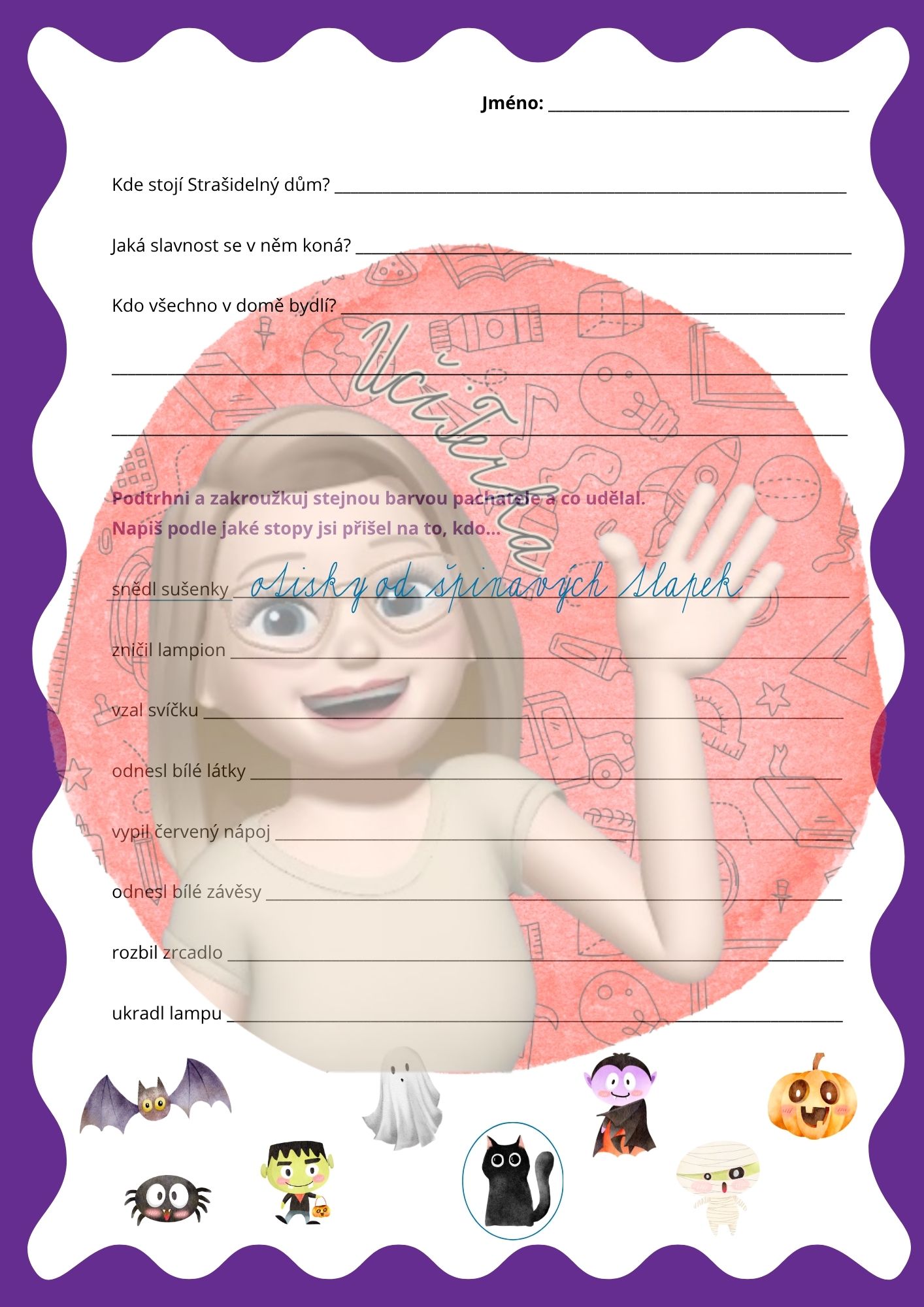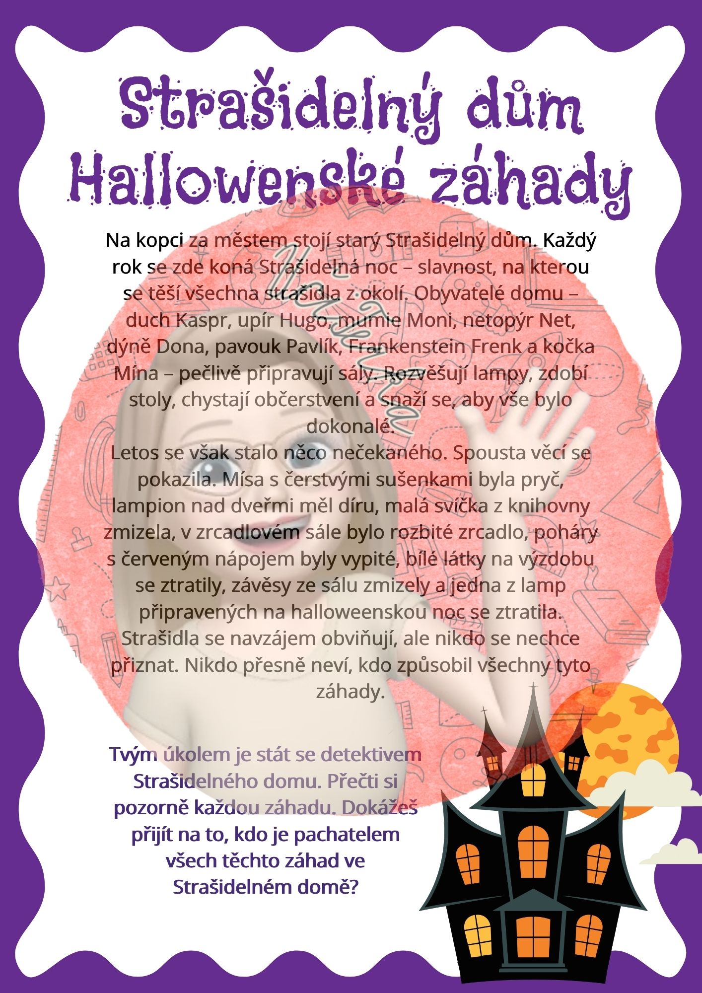 Detektivní příběh o Strašidelném domě, kde se ztrácejí různé předměty. Žáci hledají stopy, určují pachatele, odpovídají na otázky a rozvíjejí čtení s porozuměním i logické myšlení.