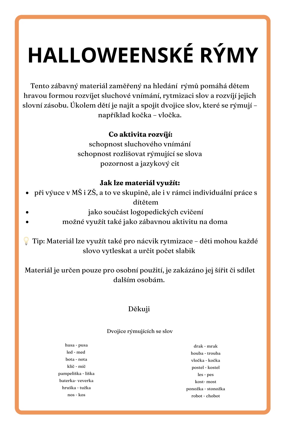 Materiál se zaměřuje na rozvoj sluchového vnímání, rozvoj jazykového citu a slovní zásoby. Vhodné pro využití ve výuce v mateřské i základní škole, a to například v rámci skupinové činnosti. Material je možné využít také při individuální práci s dítětem, při logopedické intervenci nebo v domácím prostředí.