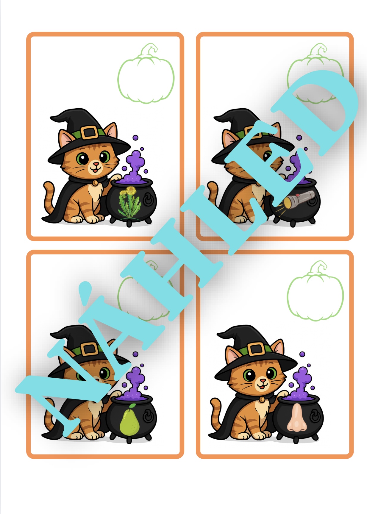 Obsahem materiálu jsou čtyři A4 strany s 16 kartami, ke kterým se přiřazují malé obrázkové kartičky obsažené na poslední páté straně A4.