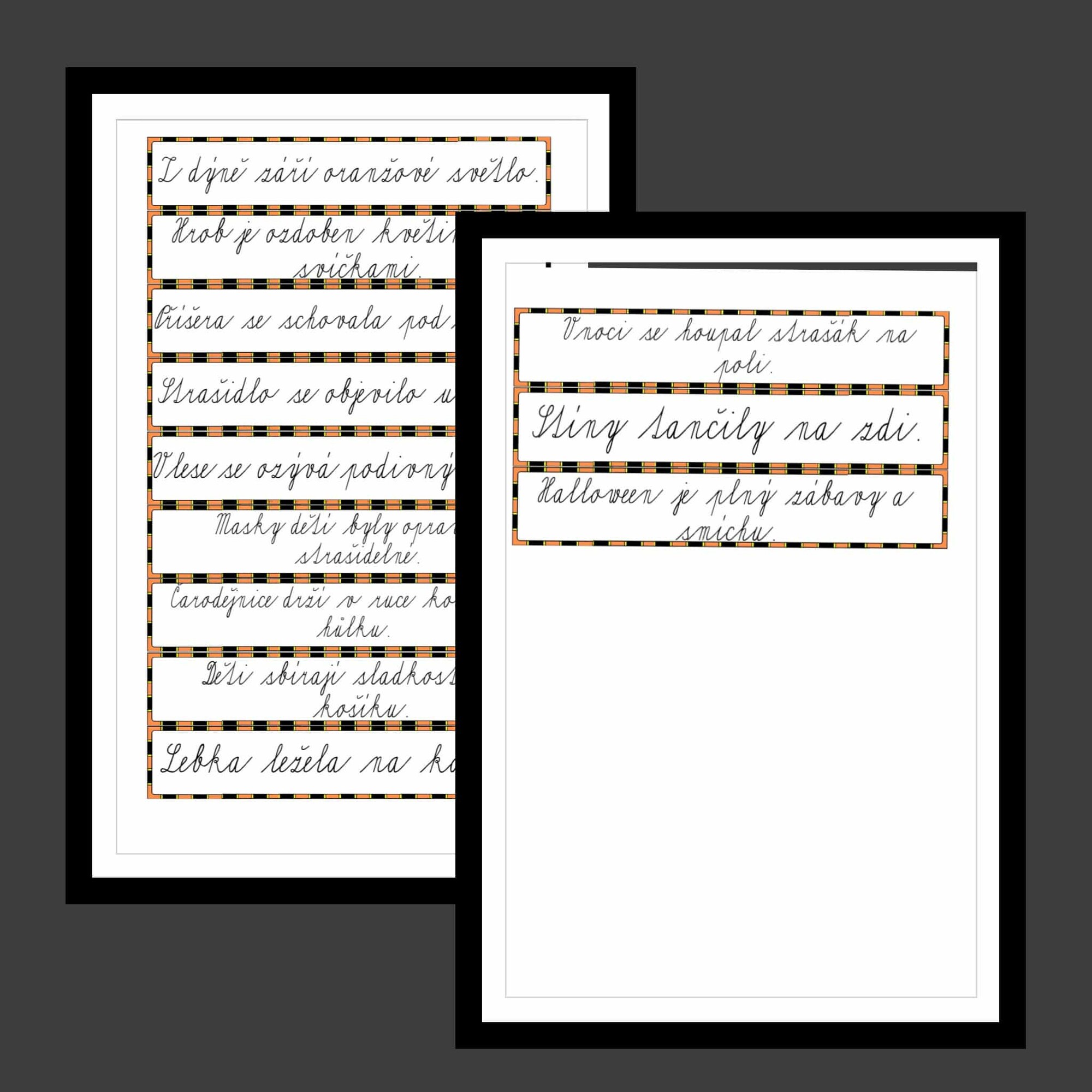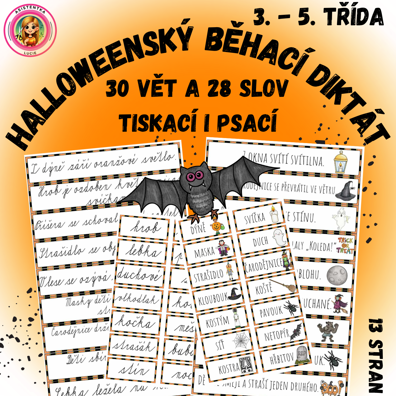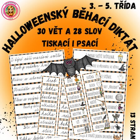 Tento materiál je zaměřen na téma Halloween a je určen pro žáky 3.–5. ročníku. Obsahuje 28 tematických slov a 30 vět v tiskací i psací podobě, které lze využít k opisu nebo k běhacímu diktátu. Texty jsou sestaveny tak, aby odpovídaly jazykové úrovni starších žáků prvního stupně a zároveň je motivovaly prostřednictvím atraktivního a blízkého tématu.
