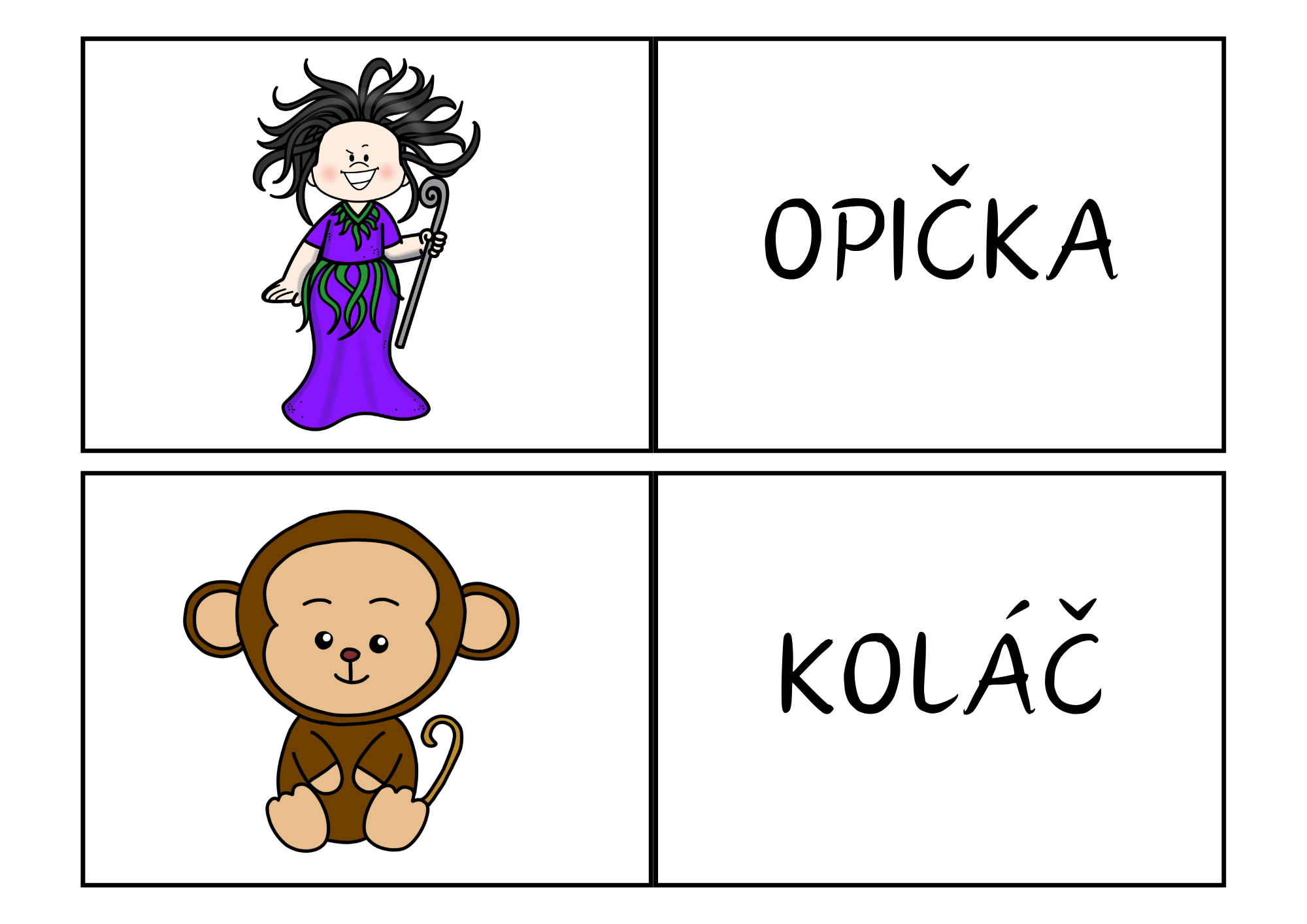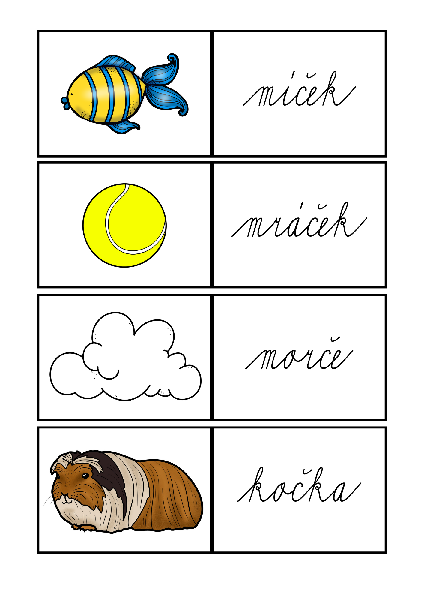 Děti spojují obrázek se správným slovem a procvičují čtení v tiskacím i psacím písmu.