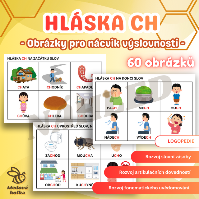 Hlavní část tohoto materiálu tvoří 60 obrázkových kartiček pro procvičení hlásky CH, které dítěti umožňují trénovat výslovnost hravou a přirozenou formou. Je však důležité postupovat krok za krokem - nejprve upevnit základní dovednosti a teprve poté přecházet k samotnému nácviku hlásky.