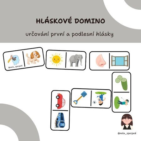 Děti spojují obrázky podle poslední a první hlásky ve slově (např. pes – slunce, slon – nos), čímž si hravou formou procvičují rozlišování hlásek.