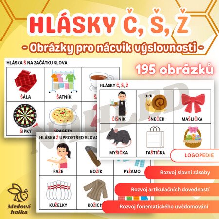 Hlavní část tohoto materiálu tvoří 195 obrázkových kartiček pro procvičení hlásek Č, Š, Ž, které dítěti umožňují trénovat výslovnost hravou a přirozenou formou. Je však důležité postupovat krok za krokem - nejprve upevnit základní dovednosti a teprve poté přecházet k samotnému nácviku hlásky.