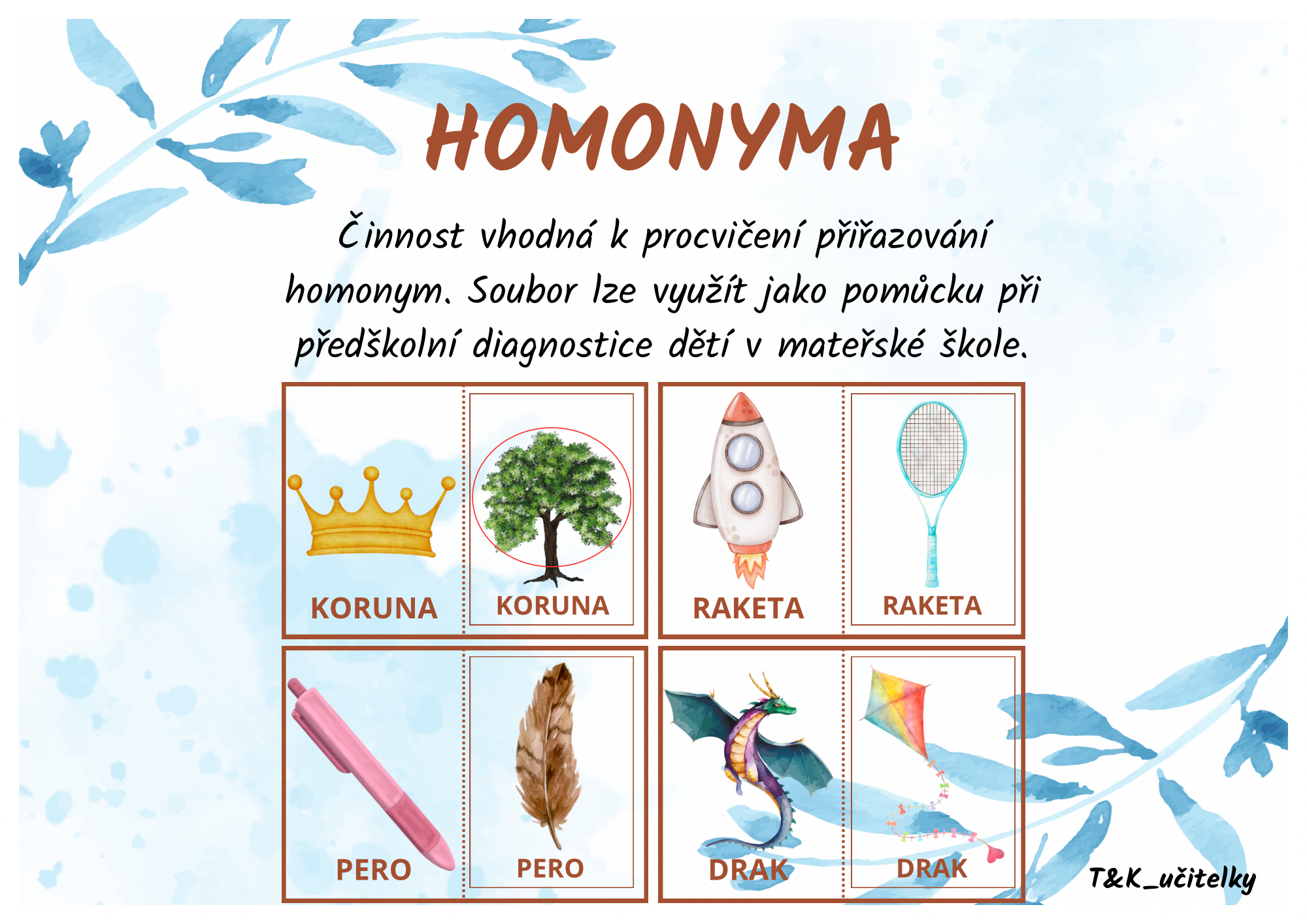 Činnost vhodná k procvičení přiřazování homonym. Soubor lze využít jako pomůcku při předškolní diagnostice dětí v mateřské škole.
