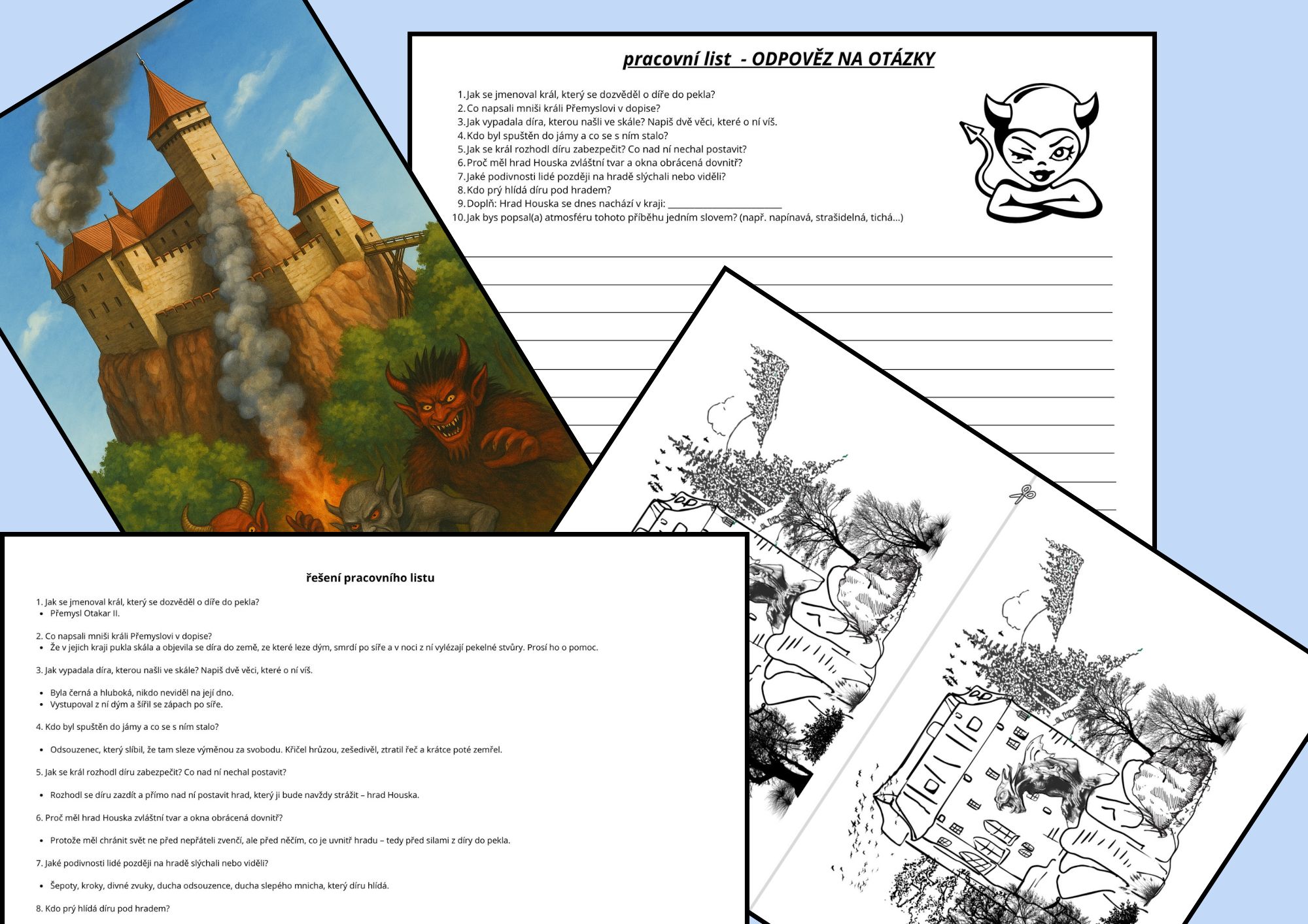 Součástí materiálu je pracovní list zaměřený na čtenářskou gramotnost – otázky vedou žáky k přesnému porozumění textu, k práci s konkrétními informacemi i k osobnímu hodnocení atmosféry vyprávění. Doplňkový tvořivý úkol podporuje fantazii a výtvarný projev (například představa, co mohlo být v jámě pod hradem).