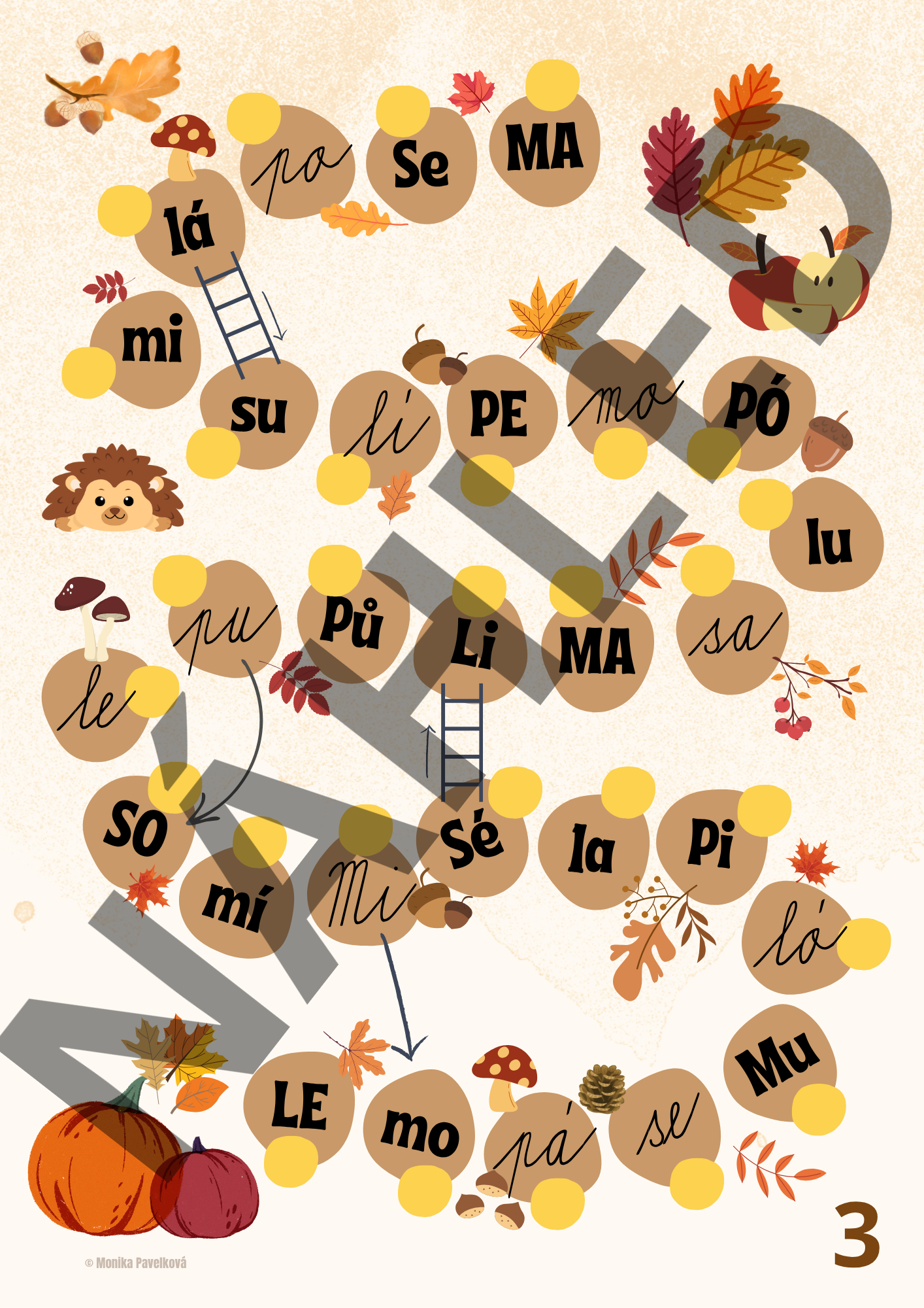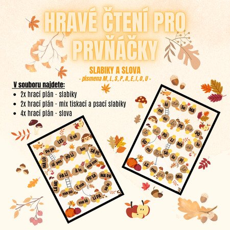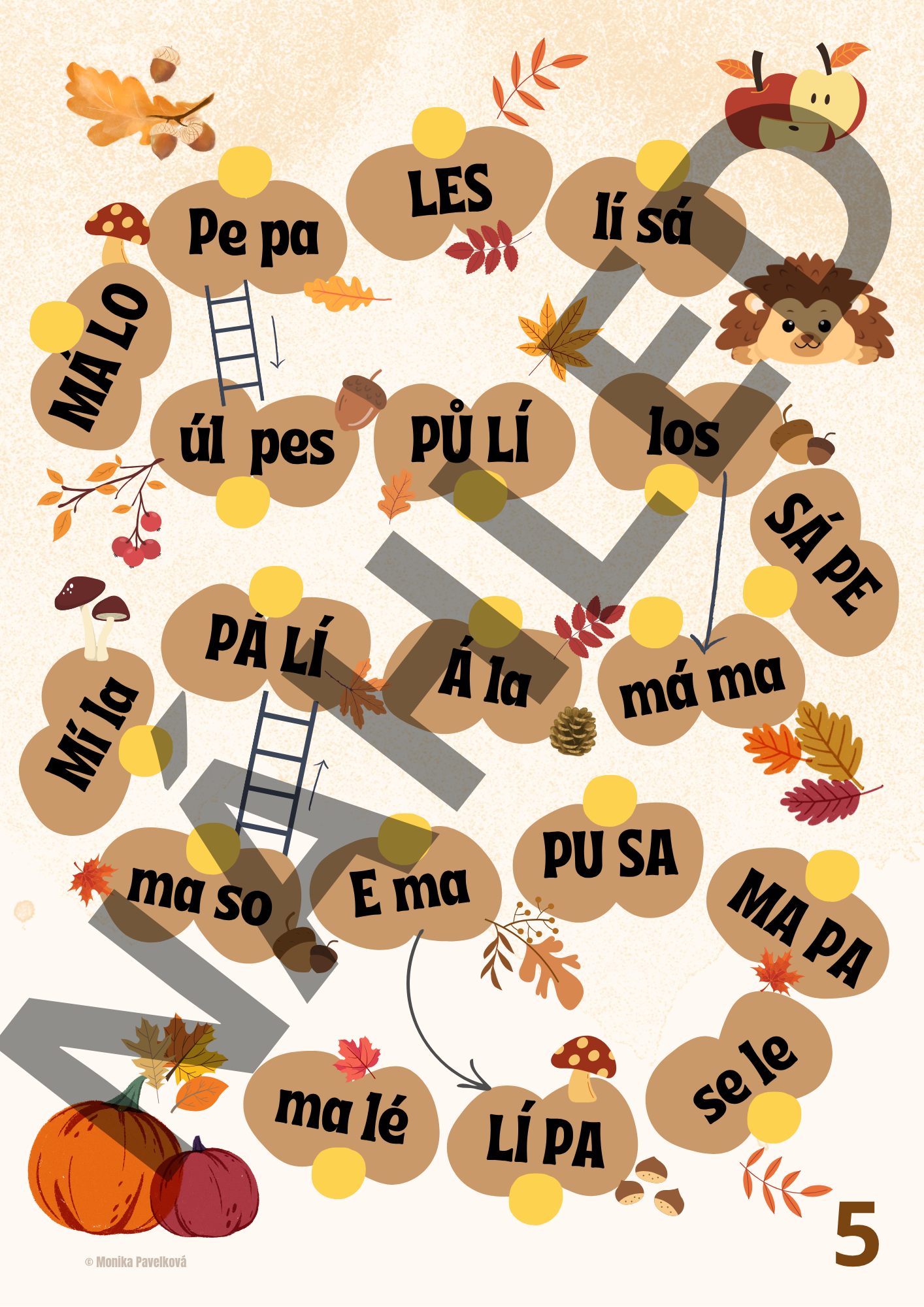 Materiál je určený k procvičení písmen M, L, S, P, A, E, I, O a U a jejich spojeni do slabik a prvních slov. Hra, která bude zaručeně bavit i ty, kteří rádi nečtou, je ideální zejména pro dvojice, případně i trojice. Soubor obsahuje osm verzí, poslední dvě jsou pro zdatnější čtenáře. Stačí vše pouze vytisknout, zalaminovat, vzít si figurku, kostku a může se začít! Výhoda při oboustranném tisku - rychlejší dvojice otočí na druhý hrací plán a může pokračovat dál.