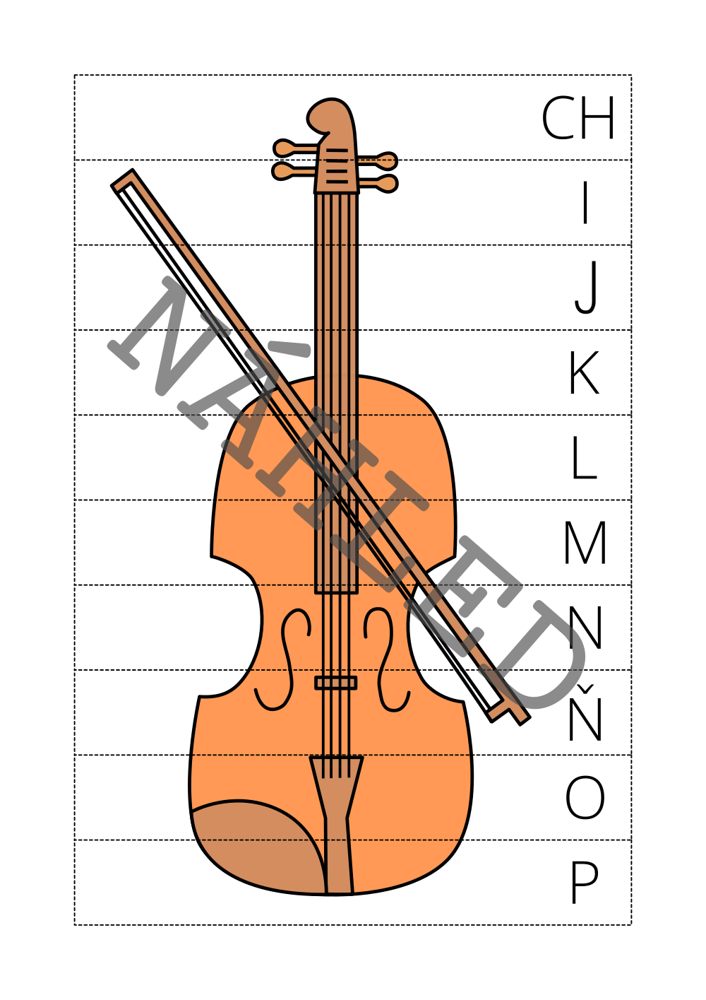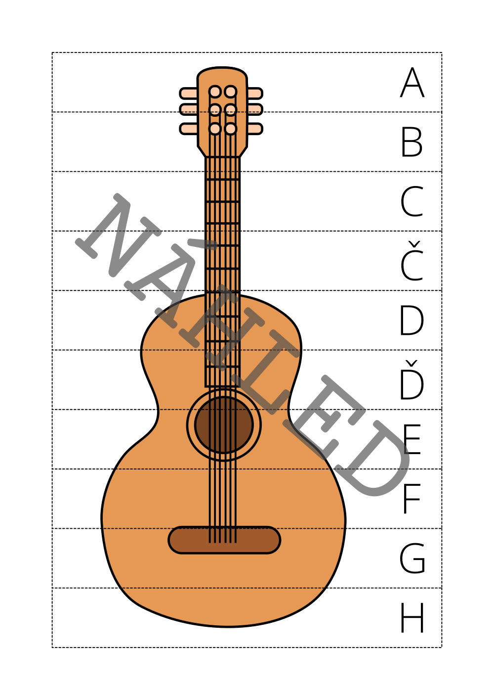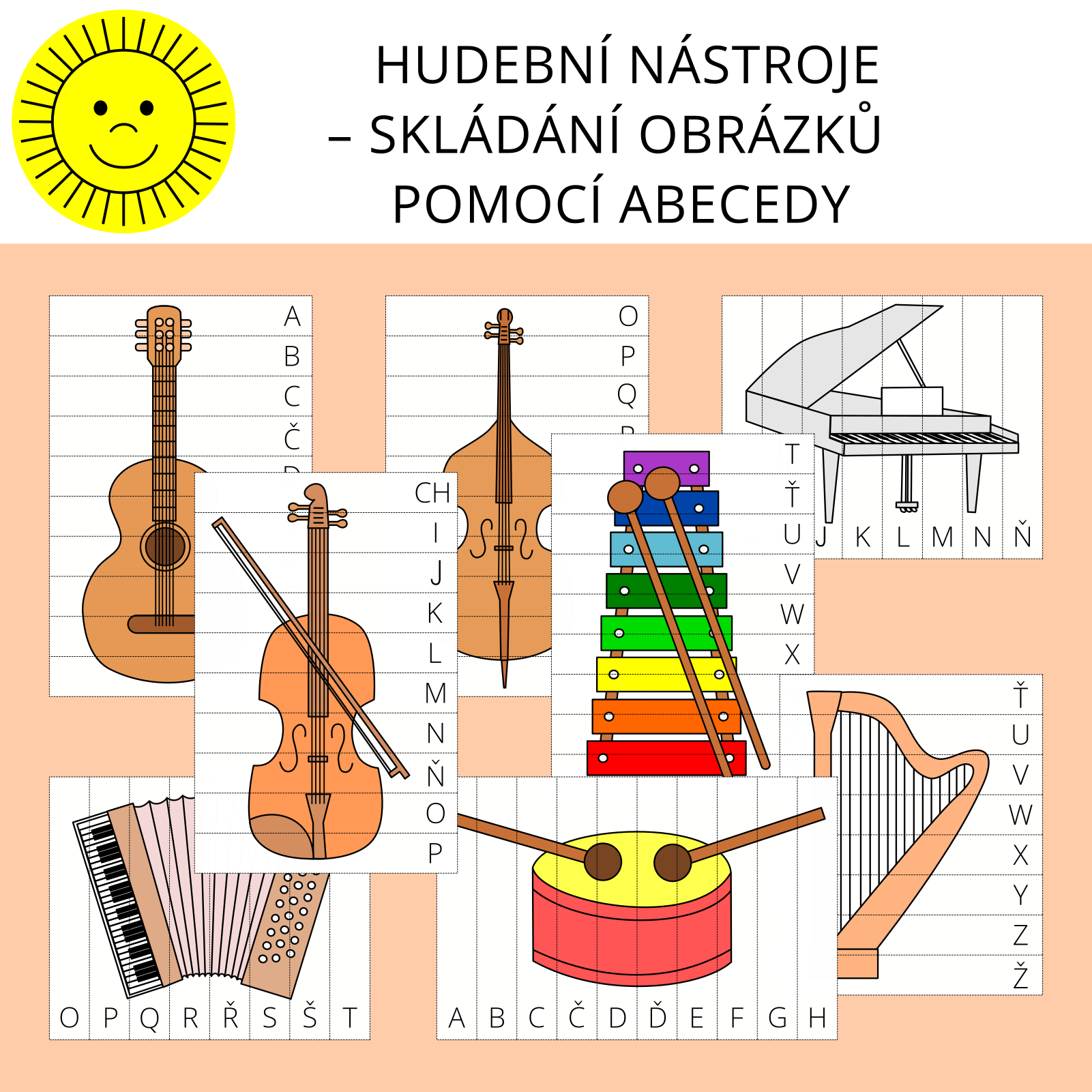 Materiál obsahuje skládačky osmi hudebních nástrojů (kytara, housle, basa, xylofon, bubínek, klavír, akordeon, harfa).