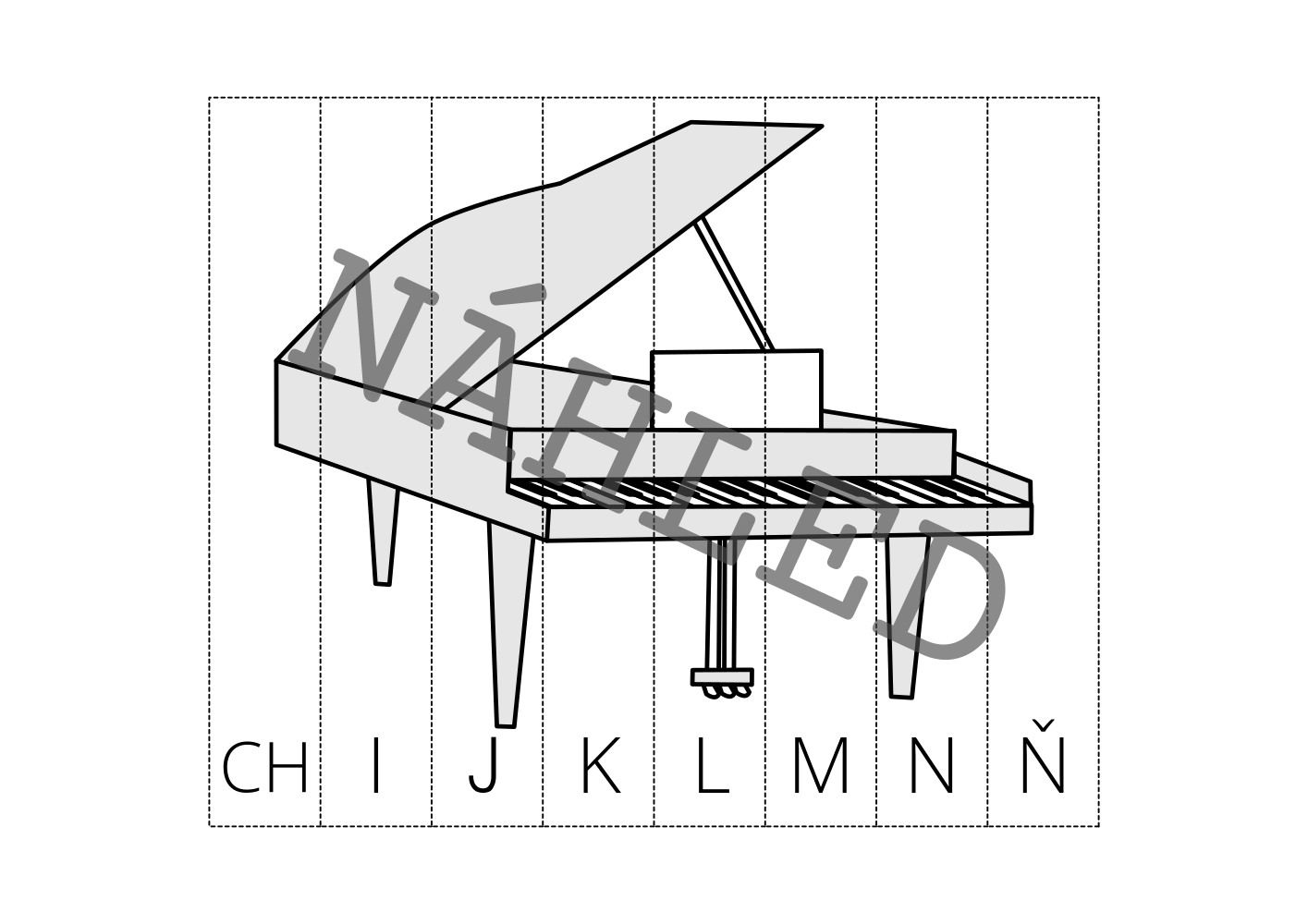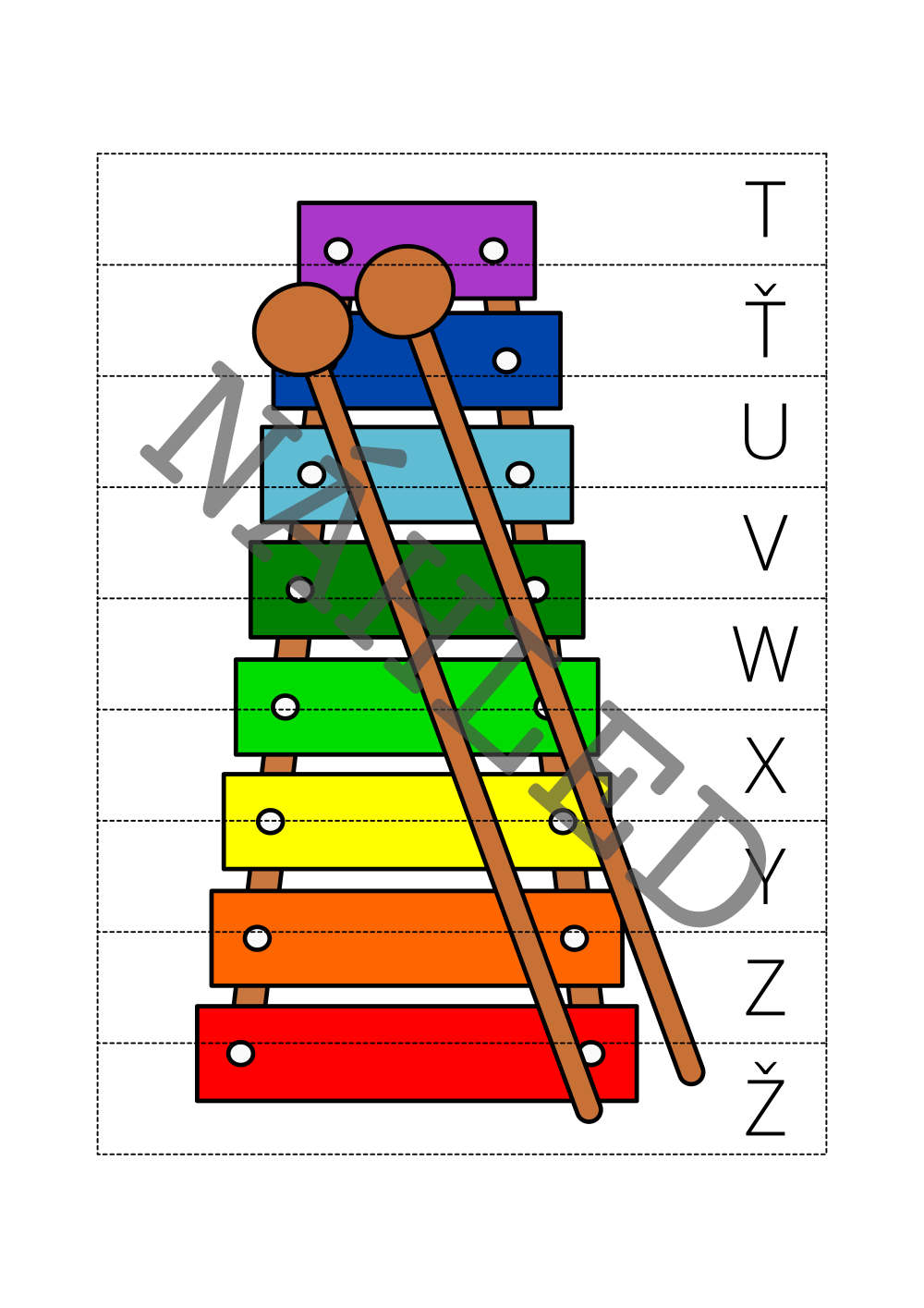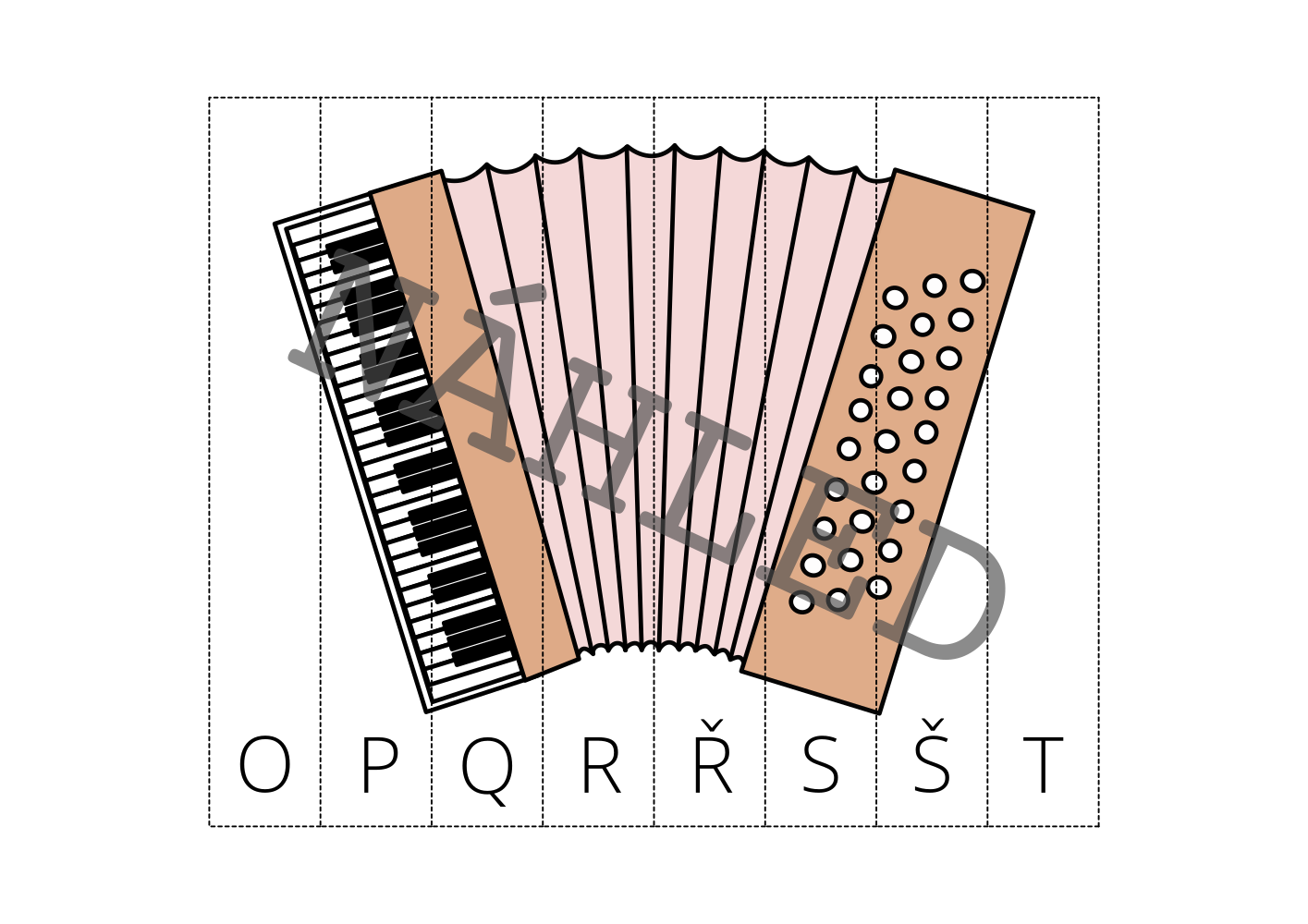 Materiál obsahuje skládačky osmi hudebních nástrojů (kytara, housle, basa, xylofon, bubínek, klavír, akordeon, harfa).