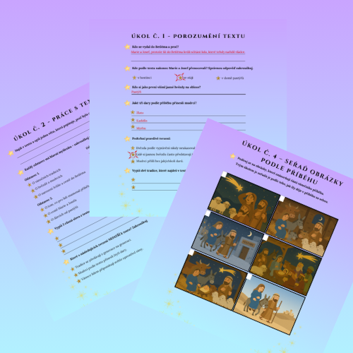 Tento výukový materiál přináší ucelenou lekci o vánočním příběhu, symbolech a tradicích, vytvořenou speciálně pro 5. ročník ZŠ. Žáci pracují s poutavým textem o narození Ježíše, následně plní úkoly na porozumění, třídění informací, práci s hlavní myšlenkou, symboly i chronologií příběhu.
