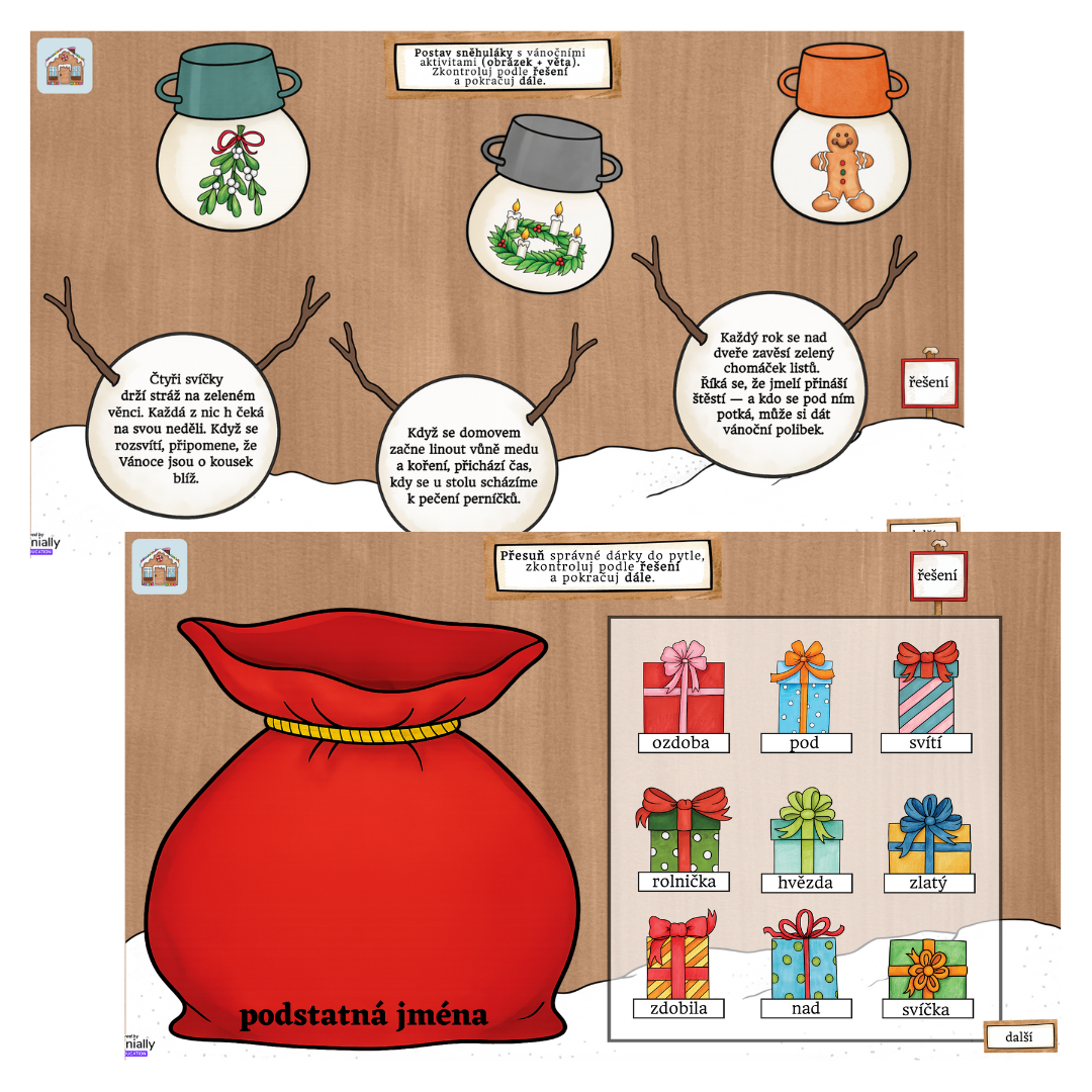 - Sněžítko s hvězdami: Druhá lekce je zaměřena na slovní druhy - podstatná jména, přídavná jména, slovesa, předložky. Děti přesouvají dárky se správnými slovními druhy do pytle.