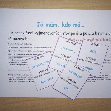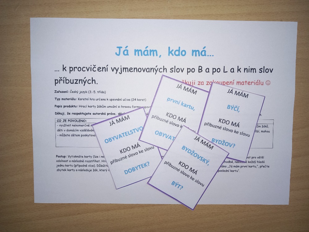 Hrací karty žákům umožní si hravou formou upevnit získané znalosti v oblasti vyjmenovaných slov po B, L a k nim slov příbuzných.