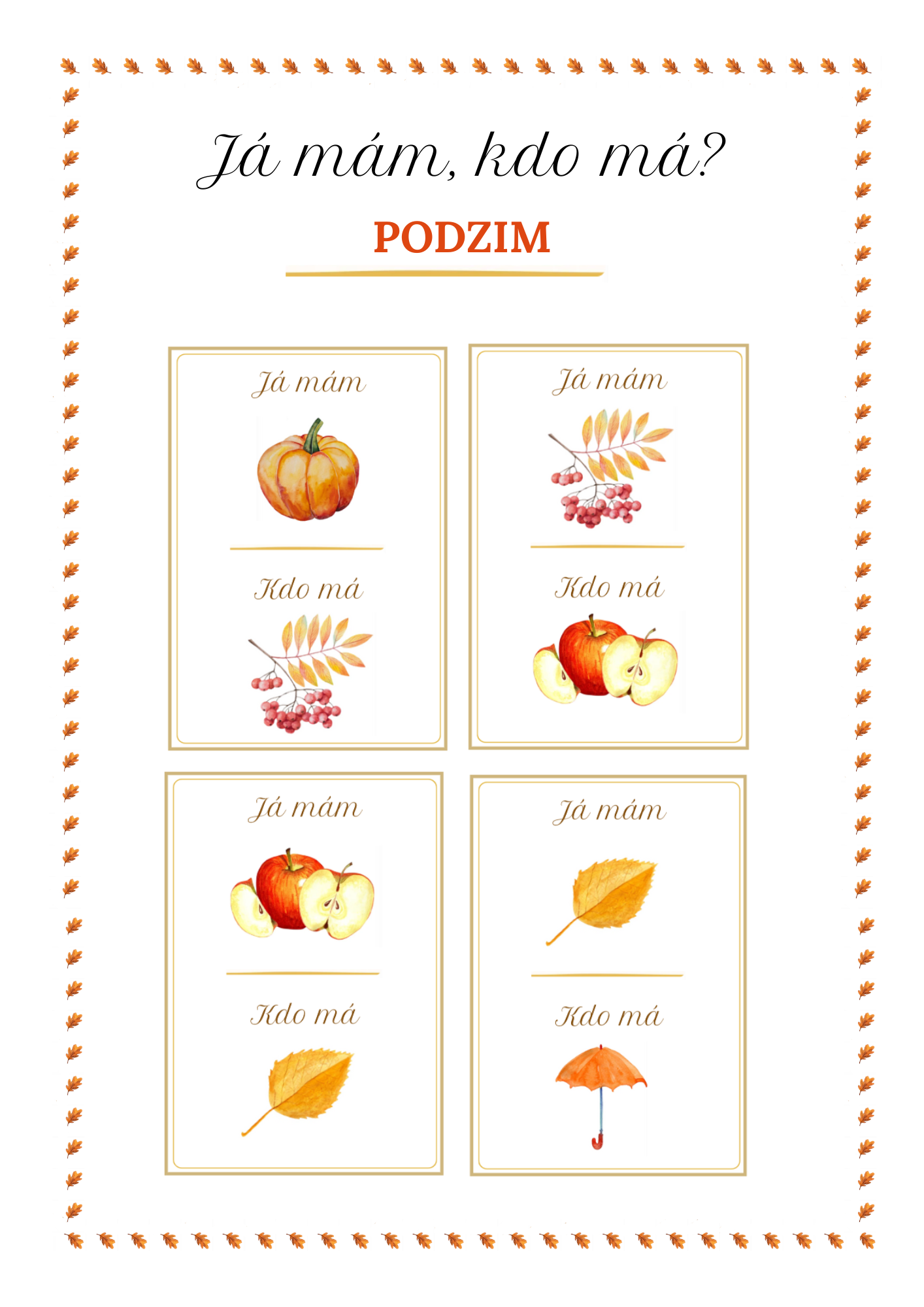 Hra ,,Já mám, kdo má'' s podzimní tématikou obsahuje 19 stran s 38 obrázky/kartičkami.