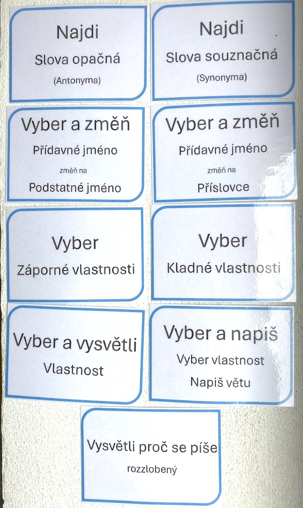 - využít karty k nácviku změny slovního druhu z přídavného jména na příslovce nebo podstatné jméno.