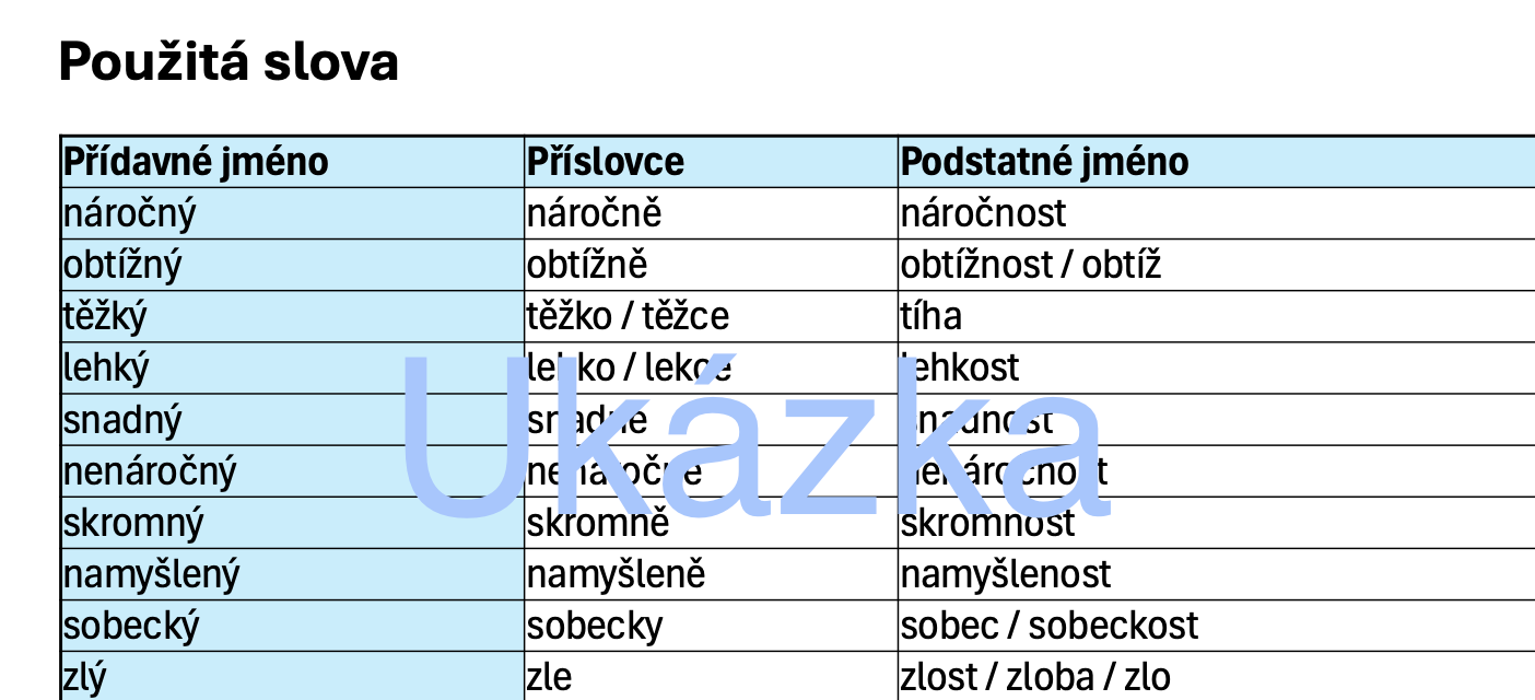 Součástí materiálu je přehledová tabulka pro učitele použitých slov ve tvaru přídavné jméno – příslovce – podstatné jméno.