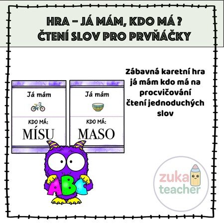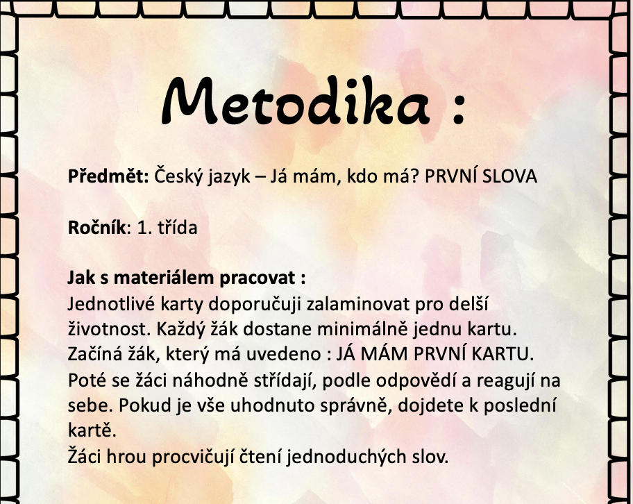 Jednotlivé karty doporučuji zalaminovat pro delší životnost. Každý žák dostane minimálně jednu kartu. Začíná žák, který má uvedeno : JÁ MÁM PRVNÍKARTU. Poté se žáci náhodně střídají, podle odpovědí a reagují na sebe. Pokud je vše uhodnuto správně, dojdete k poslední kartě.