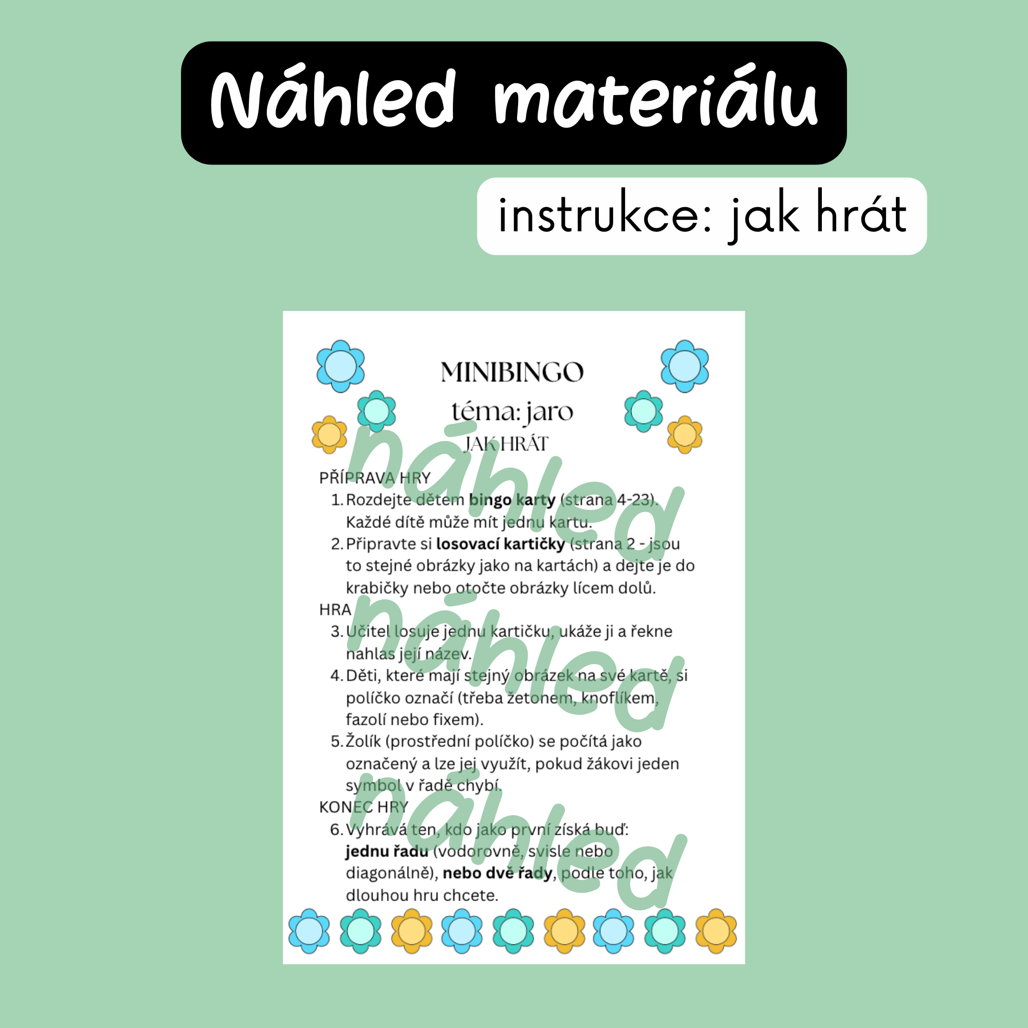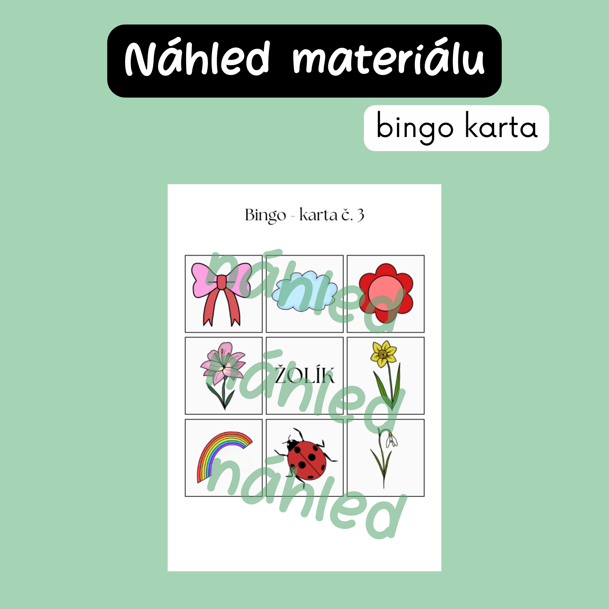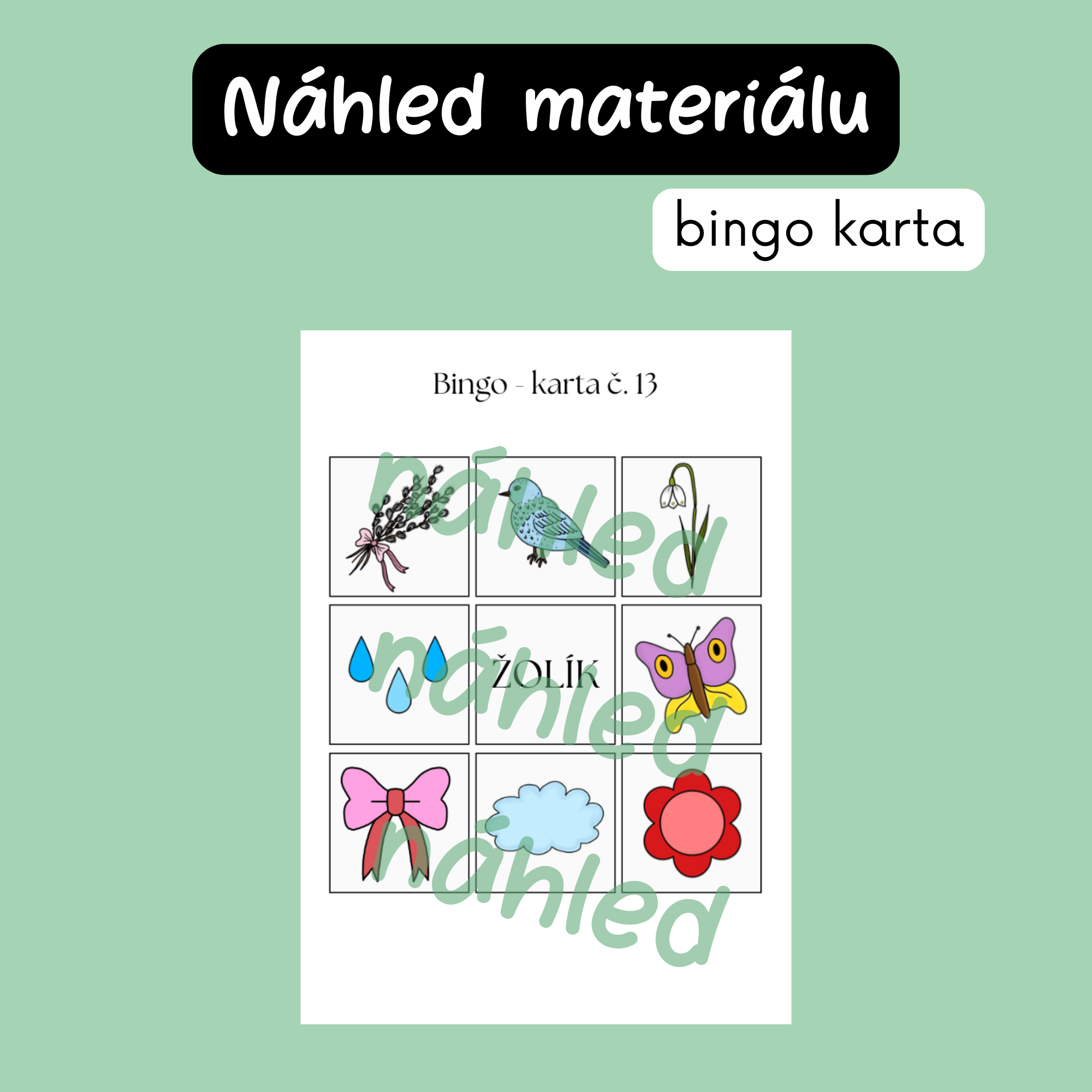 Co sada nabízí?hrací karty 3x3 s jarními ilustracemikartičky pro losovánínávod k použití a tipy pro snadnou přípravutisknutelný formát pro flexibilní použití ve třídě, družině i domaMetodické upřesnění:Aktivita je zaměřena na rozvoj slovní zásoby a kognitivních schopností dětí. Bingo karty a ilustrace poskytují vizuální podporu, která dětem pomáhá spojovat slova s obrázky. Aktivita je určena k rozvoji pozornosti a soustředění.Co sada rozvíjí?slovní zásobu a pojmypozornost a soustředěnívizuální rozlišováníporozumění jednoduchým instrukcímMožnosti využití:mateřské školy a předškolní skupinypráce ve dvojicích, skupinách i individuálnějako rozcvička, klidová aktivita nebo zábavná přestávkaTato sada spojuje učení s hrou a přináší motivující, barevnou a zábavnou formu procvičování slovní zásoby.