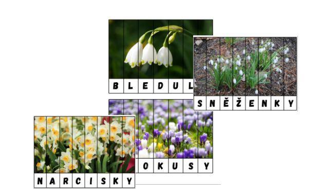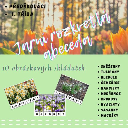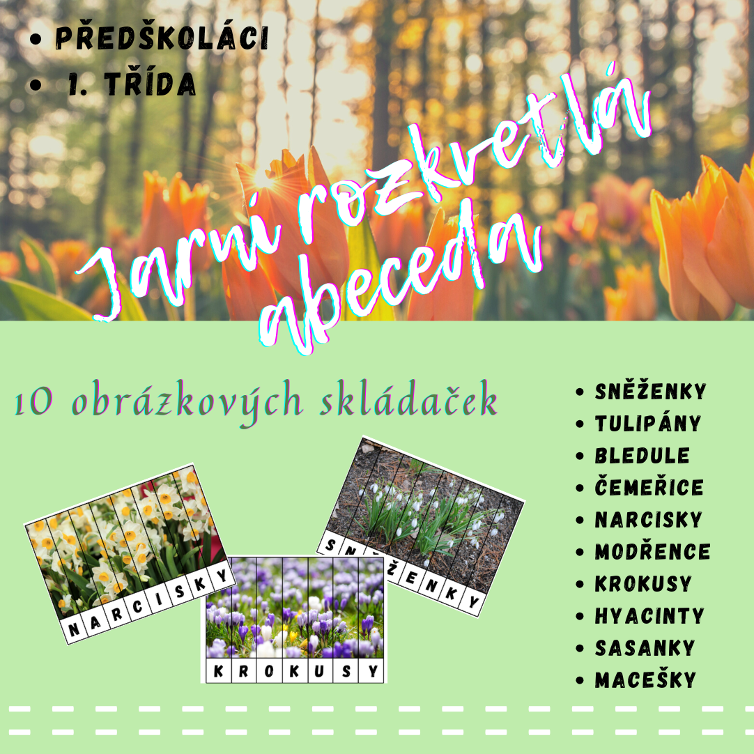 Soubor obsahuje hravé obrázkové skládačky zaměřené na poznávání jarních květin a procvičování písmen/čtení. Ideální aktivita pro rozvoj zrakového vnímání, jemné motoriky a předčtenářských či čtenářských dovedností. Pro úsporu tisku jsou na každé A4 umístěny 2 skládačky květin.