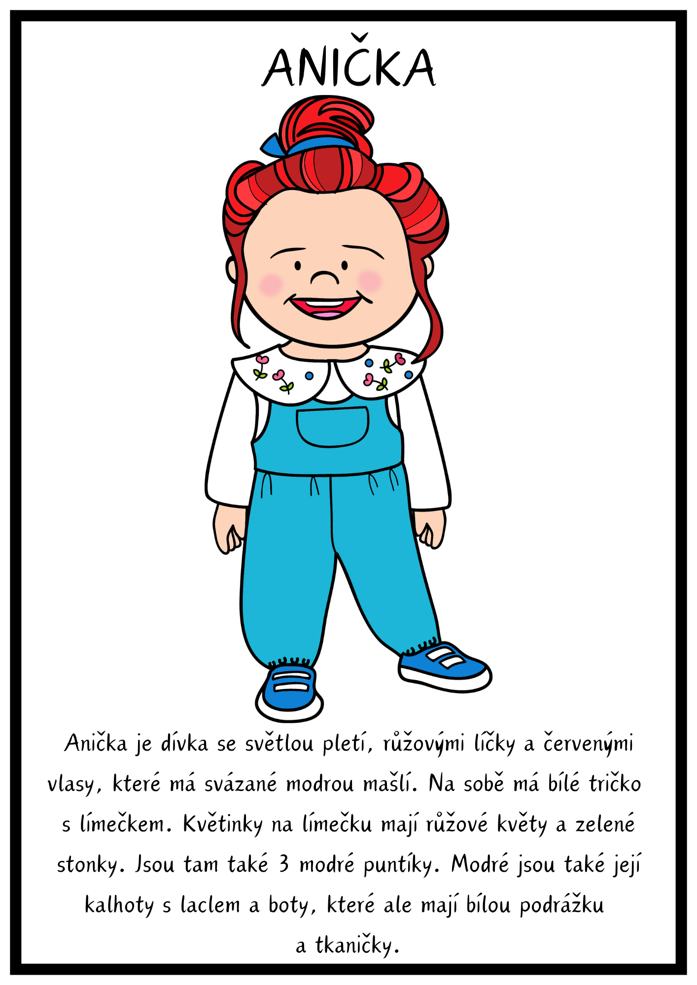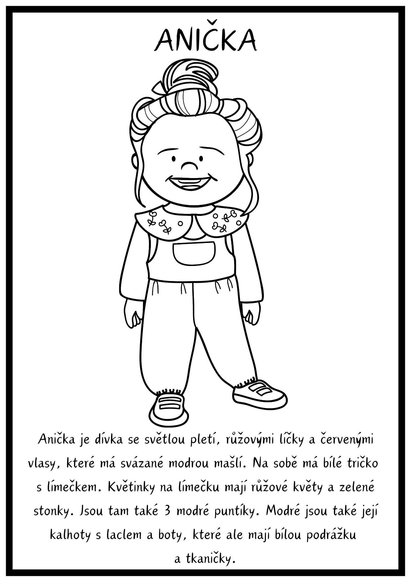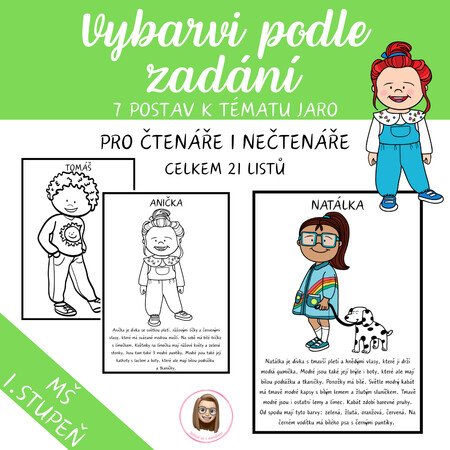 Soubor je zaměřen na práci podle slovního zadání a rozvoj porozumění slyšenému i čtenému textu. Děti vybarvují jednu ze 7 postav podle popisu a zároveň si upevňují znalost barev, částí těla a oděvu.