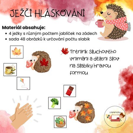 Děti vybírají obrázky, vytleskávají názvy a přiřazují obrázky ježkovi se stejným počtem jablíček, jako má slovo slabik.