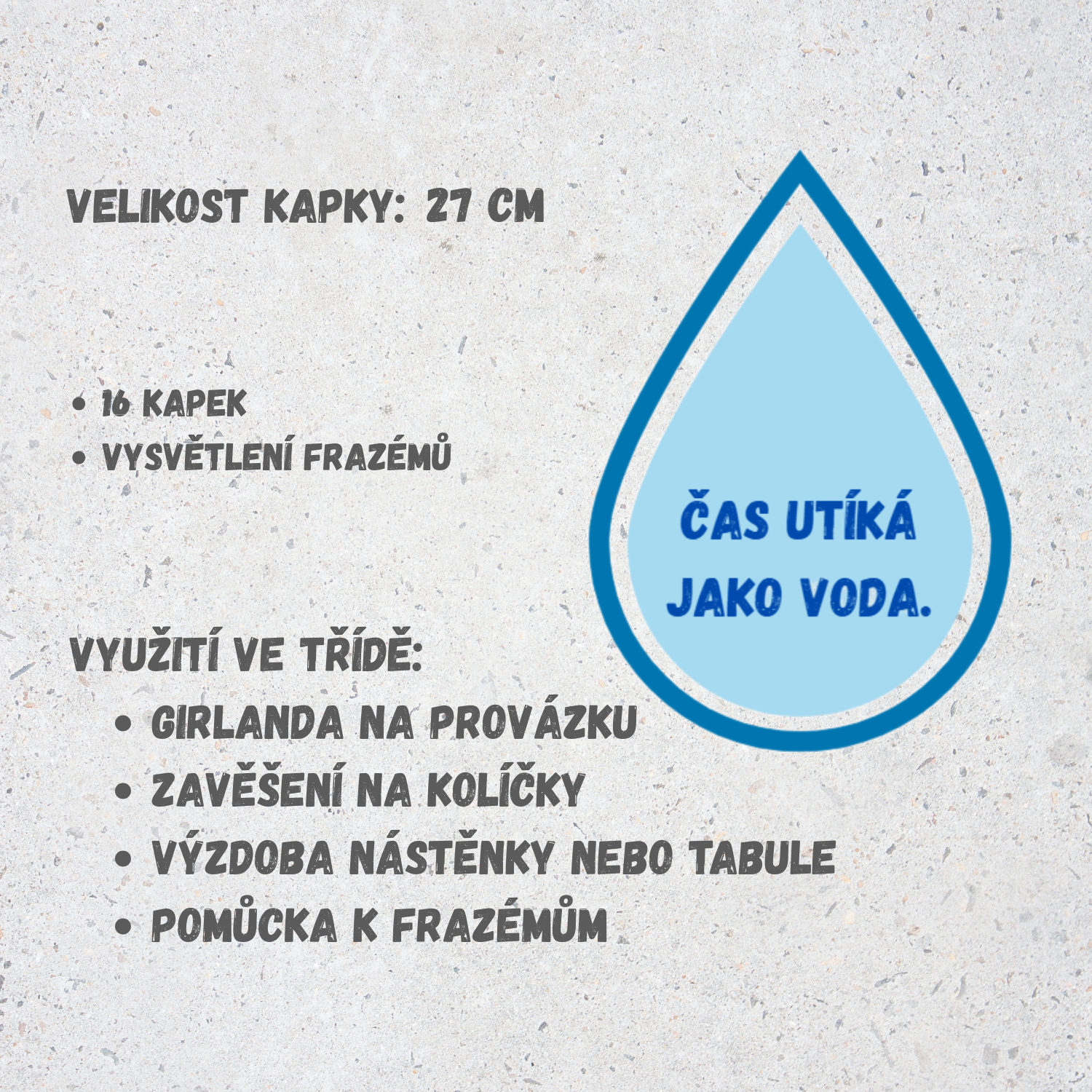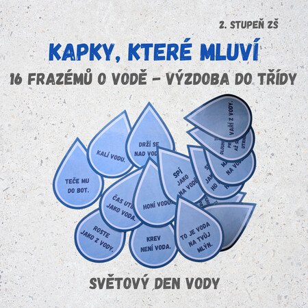 Soubor obsahuje 16 kapek s českými frazémy o vodě, které mohou sloužit jako tematická výzdoba do třídy ke Světovému dni vody i jako nenápadná jazyková inspirace během hodin českého jazyka.