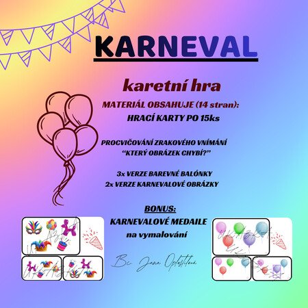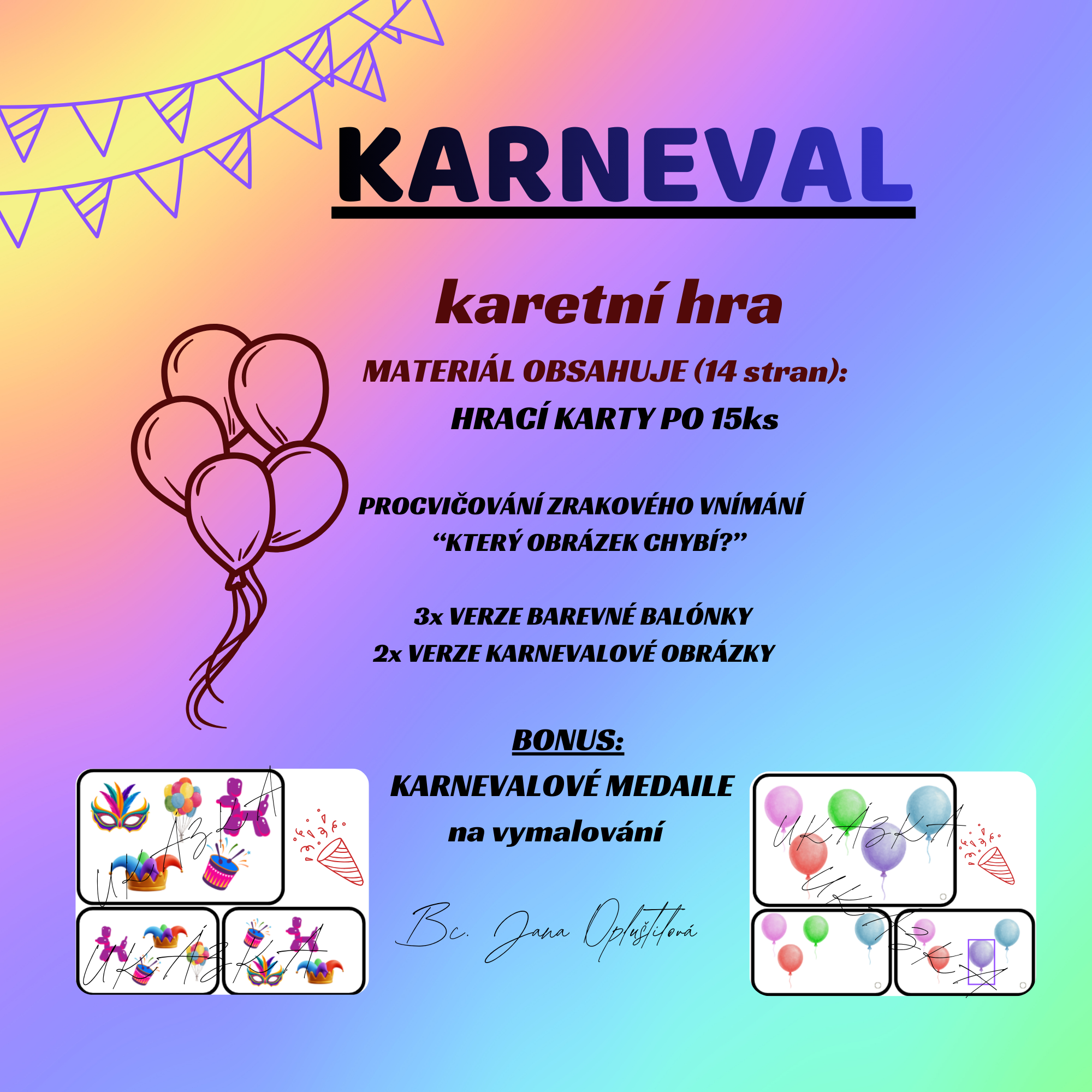 Tematická karetní hra s karnevalovým motivem, zaměřená na procvičení barev, rozvoj zrakového vnímání, pozornosti, paměti, slovního vyjadřování a logického myšlení u dětí předškolního a mladšího školního věku.