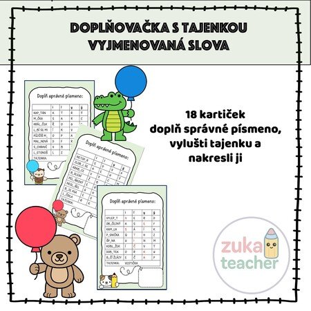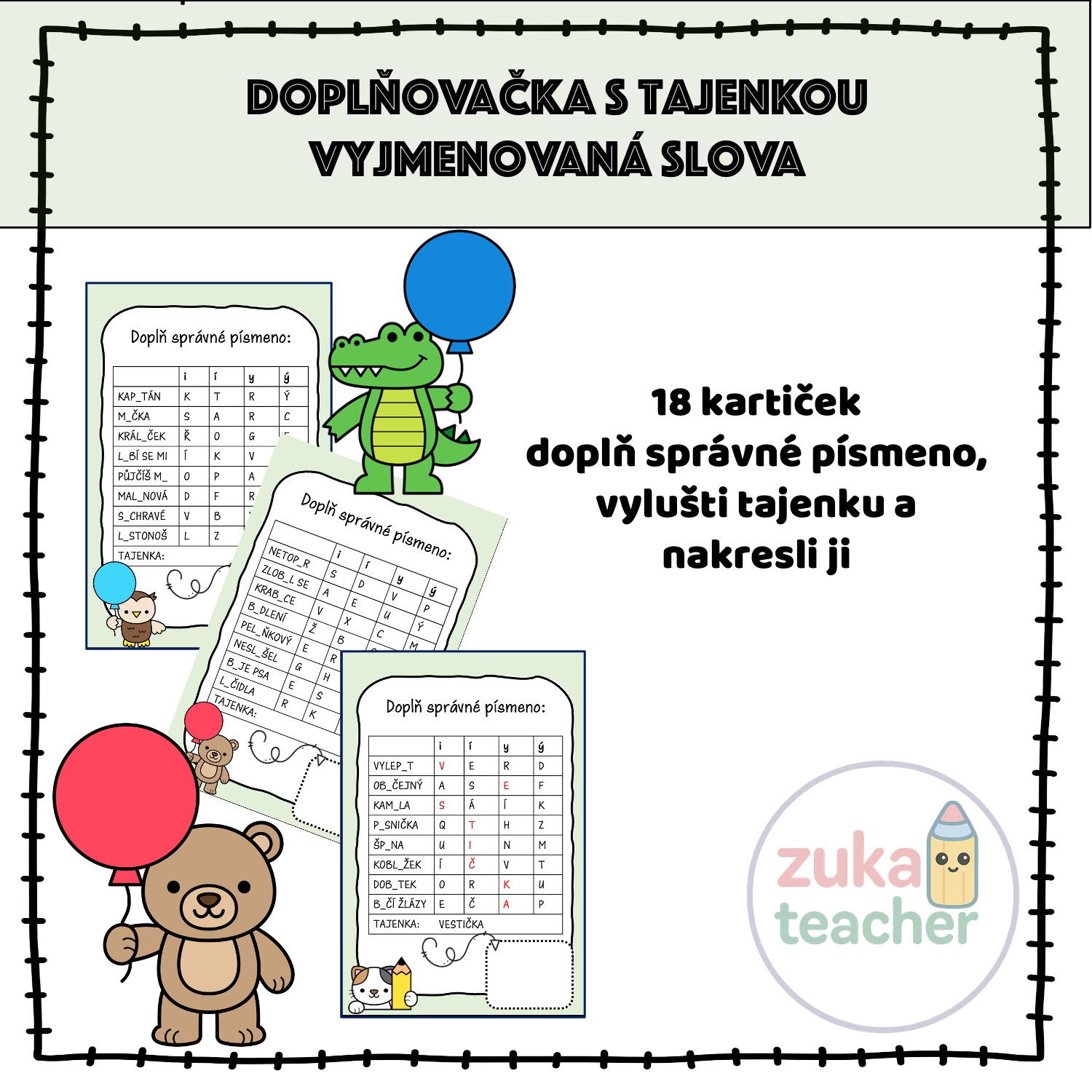 18 kartiček s doplňováním i/í/y/ý na procvičování vyjmenovaný slov. Úkolem dětí je vybrat správné písmeno a zakroužkovat písmeno v příslušném sloupečku. Pokud vyluští dobře, získá tajenku. Tajenku napíše dolů a nakreslí do čtverečku.