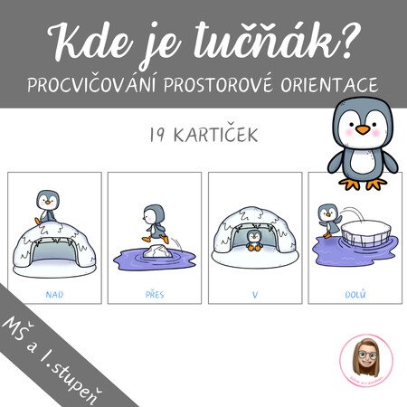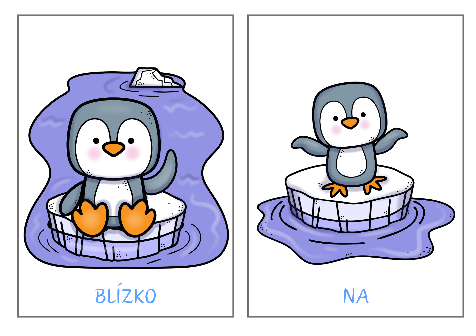 Děti určují, kde se tučňák nachází, učí se rozlišovat polohu předmětů v prostoru a reagovat na slovní pokyny.