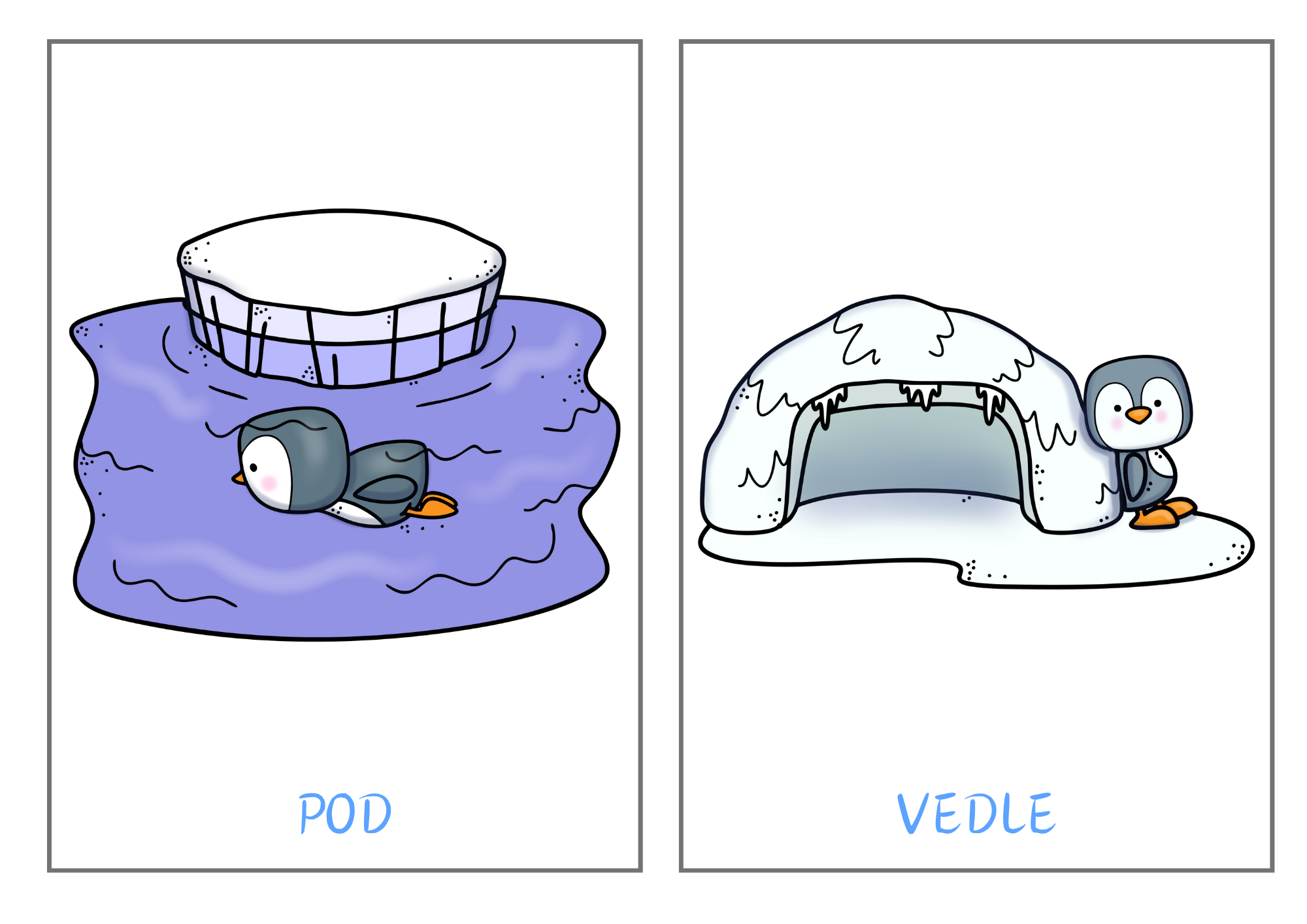 Děti se naučí používat pojmy prostorové orientace jako nad, pod, mezi, vedle, za, před, vpravo, vlevo, uprostřed a další – vždy ve spojení s obrázky z polárního prostředí.