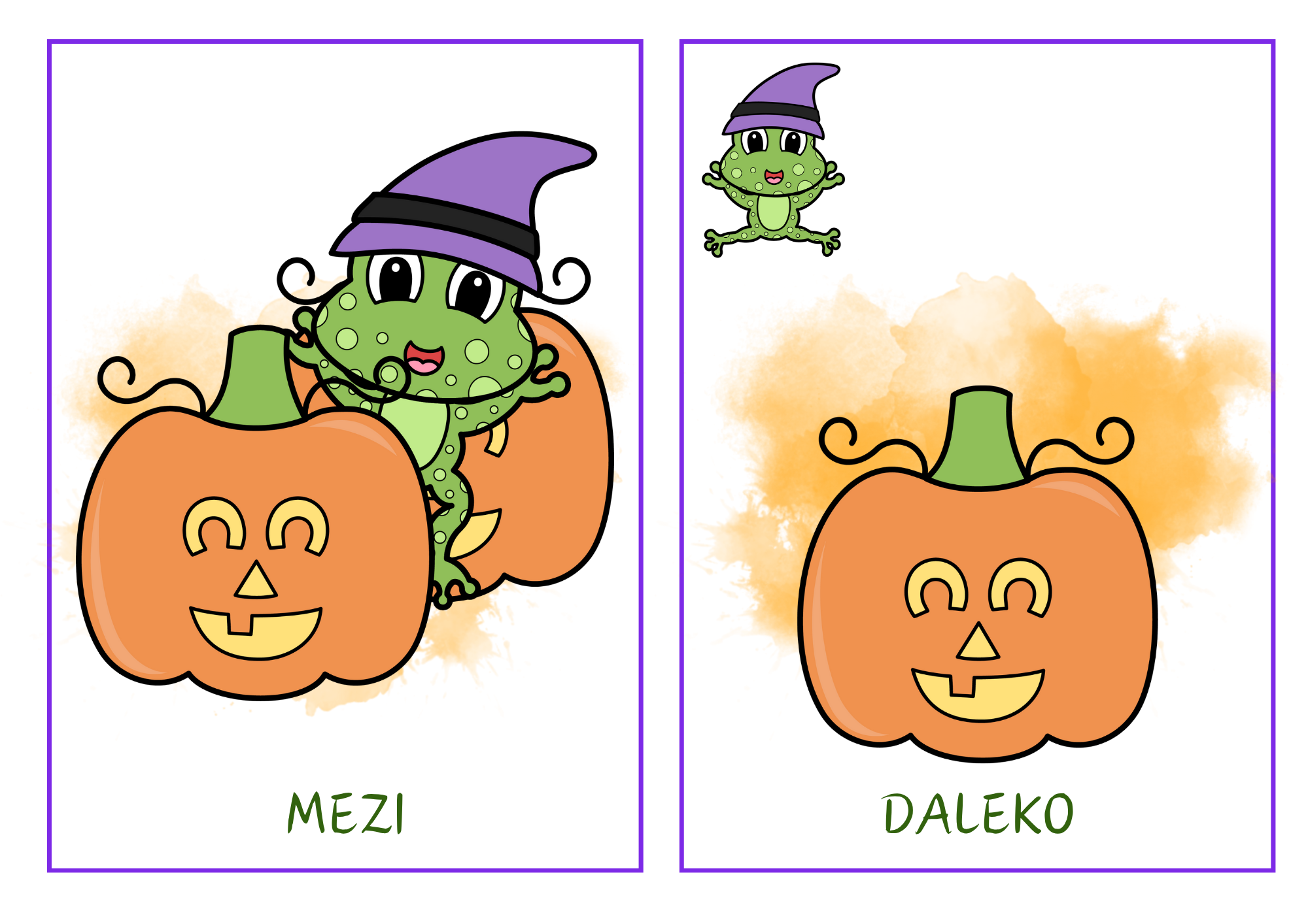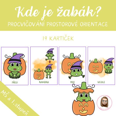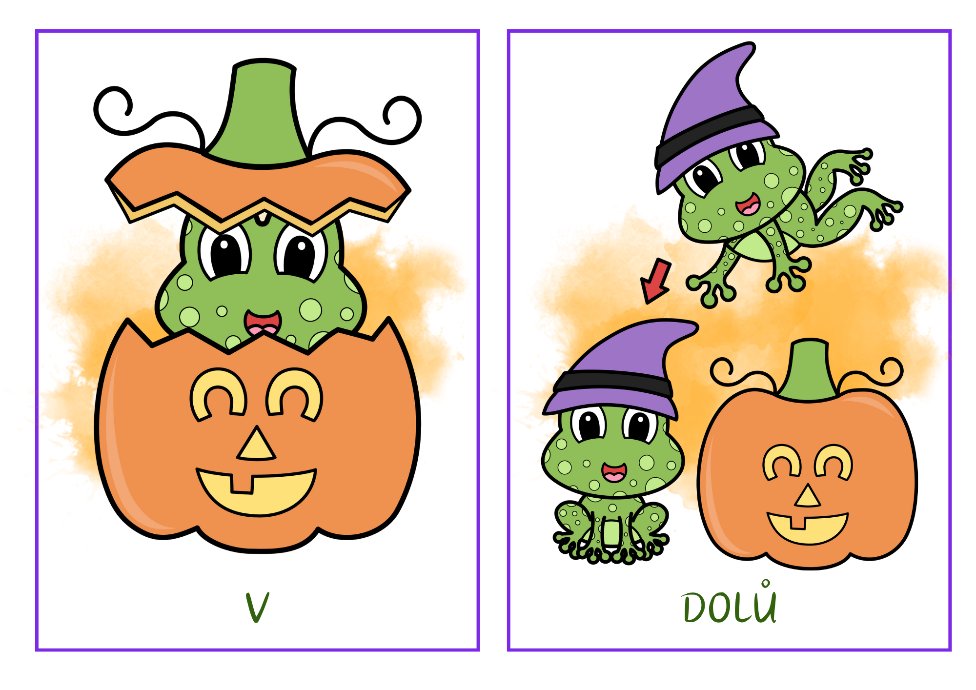 Zábavný materiál pro rozvoj prostorové orientace, porozumění předložkám a řečových dovedností. Děti si procvičí, jak popsat polohu předmětů – kde je žabák? Nad dýní, pod listem, mezi kameny...?