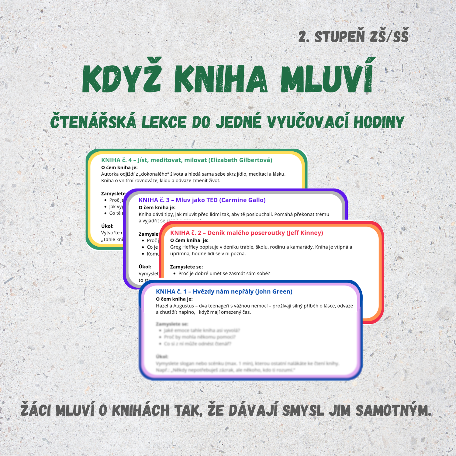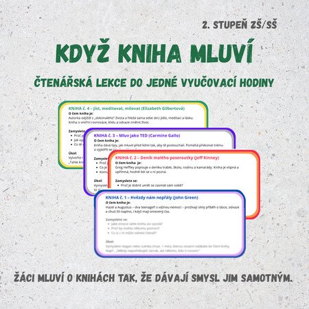 Když kniha mluví je hotová čtenářská lekce určená pro 2. stupeň ZŠ a SŠ. Je postavená na spolupráci, diskusi a sdílení – ne na referátu ani převyprávění děje. Cílem je, aby žáci dokázali o knize mluvit tak, že jí sami rozumějí a dokážou vysvětlit, proč má smysl ji číst.