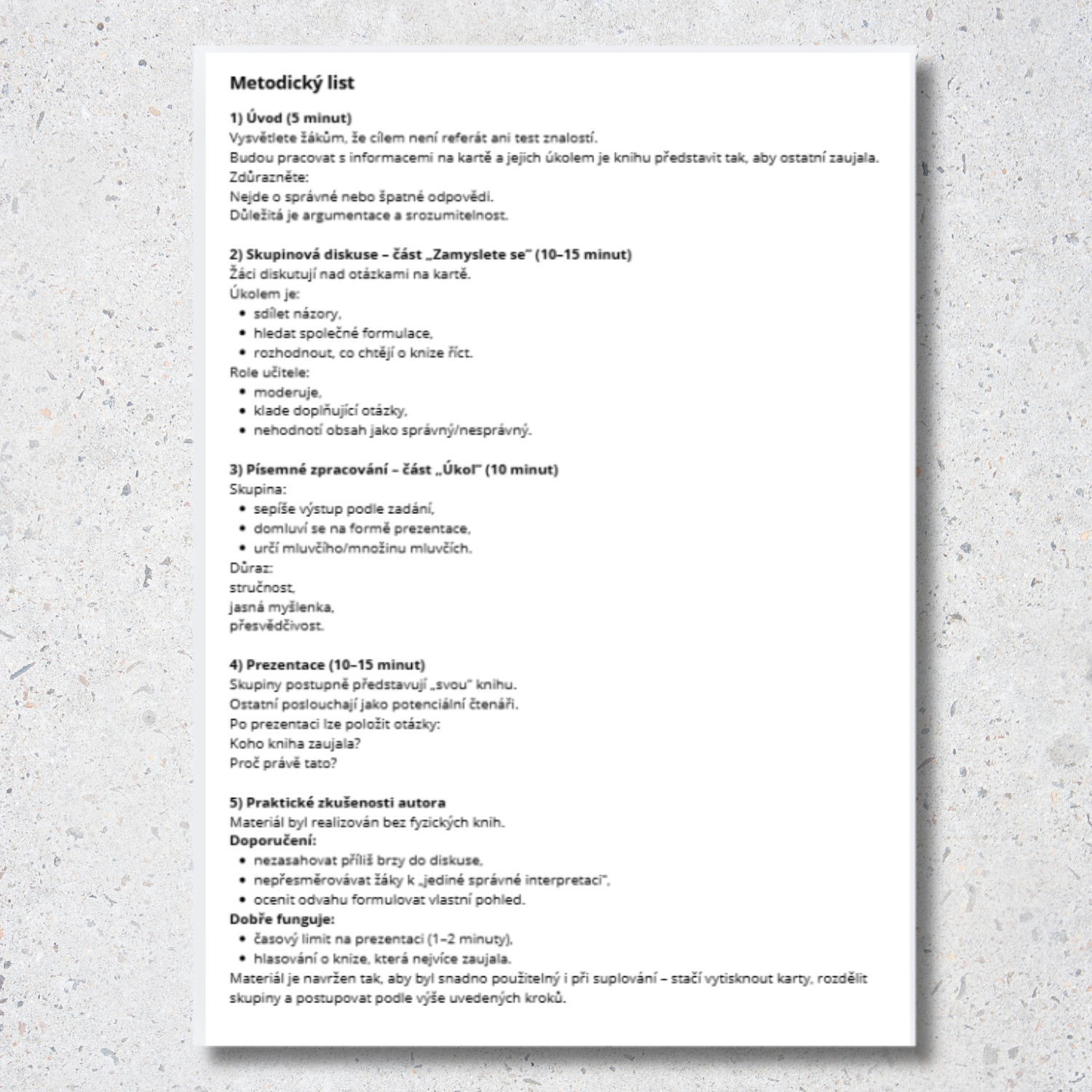 Žáci pracují ve čtyřech skupinách. Každá skupina dostává jinou knihu a jednu kartu, která určuje úhel pohledu, z něhož se na knihu dívá. Karty vedou žáky k řízené diskusi (Zamyslete se), následnému písemnému zpracování (Úkol) a krátké prezentaci před třídou. Smyslem prezentace není podat vyčerpávající informace, ale zaujmout ostatní a nabídnout osobní pohled na knihu.