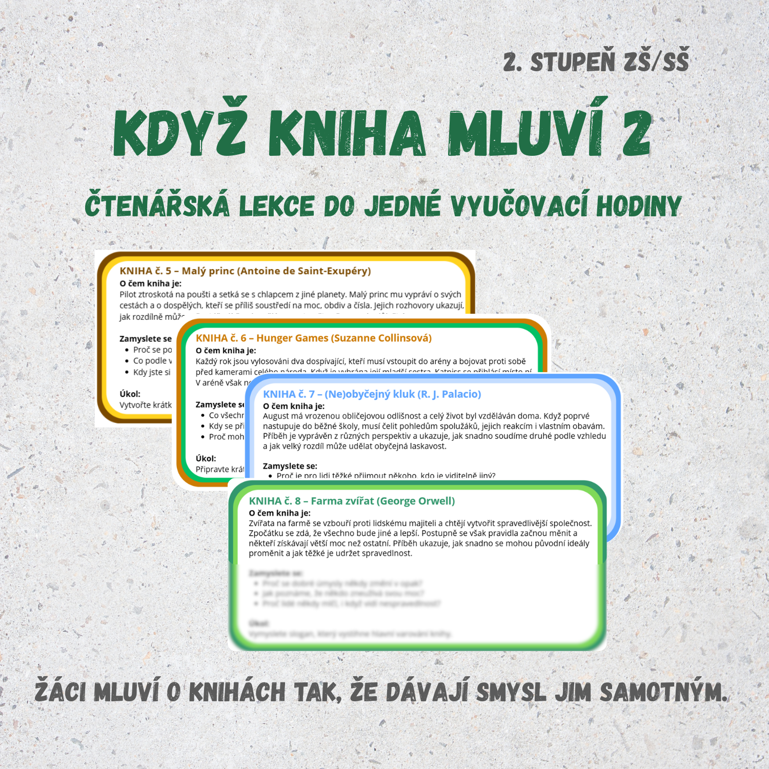 Lekce je navržena tak, aby se dala realizovat během jedné vyučovací hodiny a je možné ji kombinovat s prvním dílem série nebo obměňovat podle výběru knih a potřeb třídy.