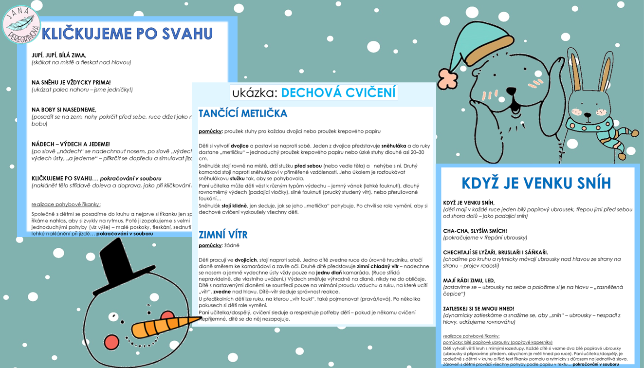 Ke každé pohybové říkance patří DECHOVÉ cvičení, které přímo navazuje na její obsah – například po pohybové říkance o sněhulákovi děti spolupracují ve dvojici a foukají do proužku papíru, který představuje sněhulákovu metličku, a sledují, jak se pohybuje.