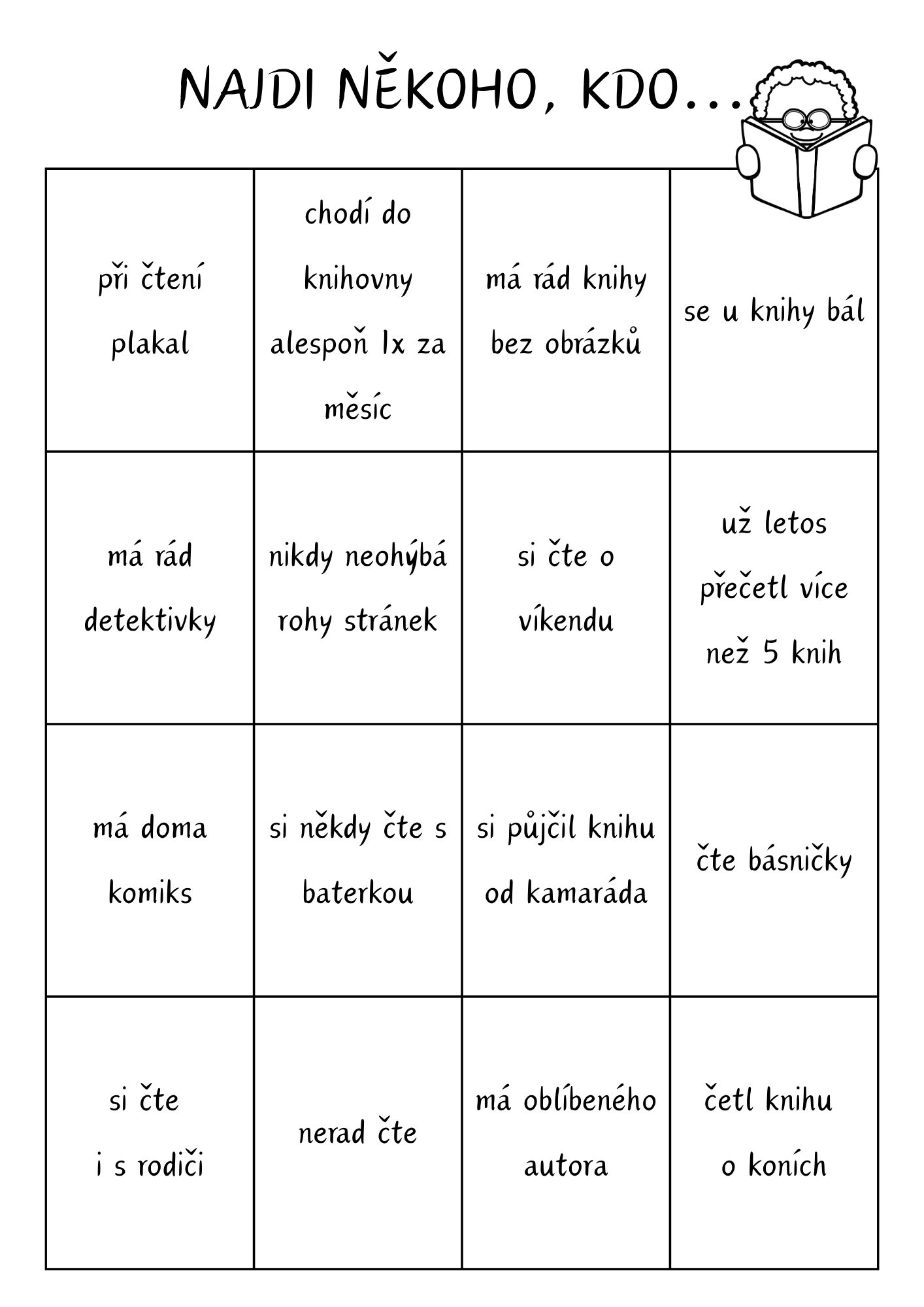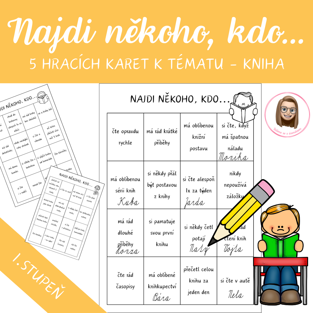 Materiál je vytvořen k tematickému období Březen – měsíc knihy a hravou formou podporuje vztah dětí ke čtení. Obsahuje 5 hracích karet, každá karta má 16 výroků zaměřených na knihy, čtení a čtenářské zážitky (celkem 80 výroků).