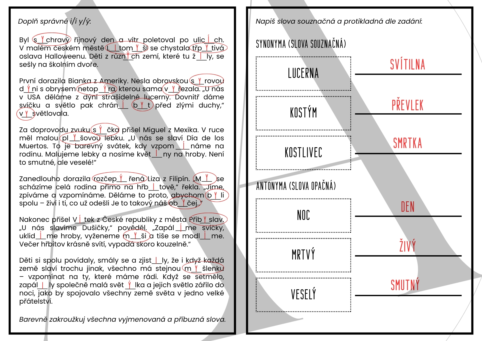 - Doplňování pravopisu a vyjmenovaných slov – příběh s vynechanými i/í/y/ý pro procvičení pravopisu a vyjmenovaných slov.