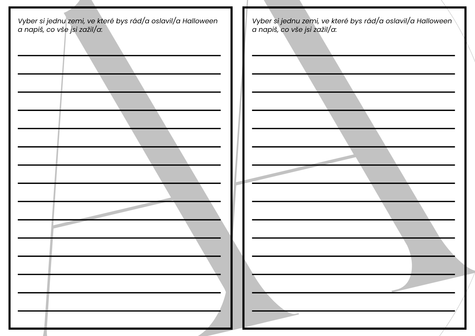 - Slohový úkol (2x A5) – zamyšlení se nad tím, že žáci slaví Halloween v jiné zemi a popsání toho, co zažívají.