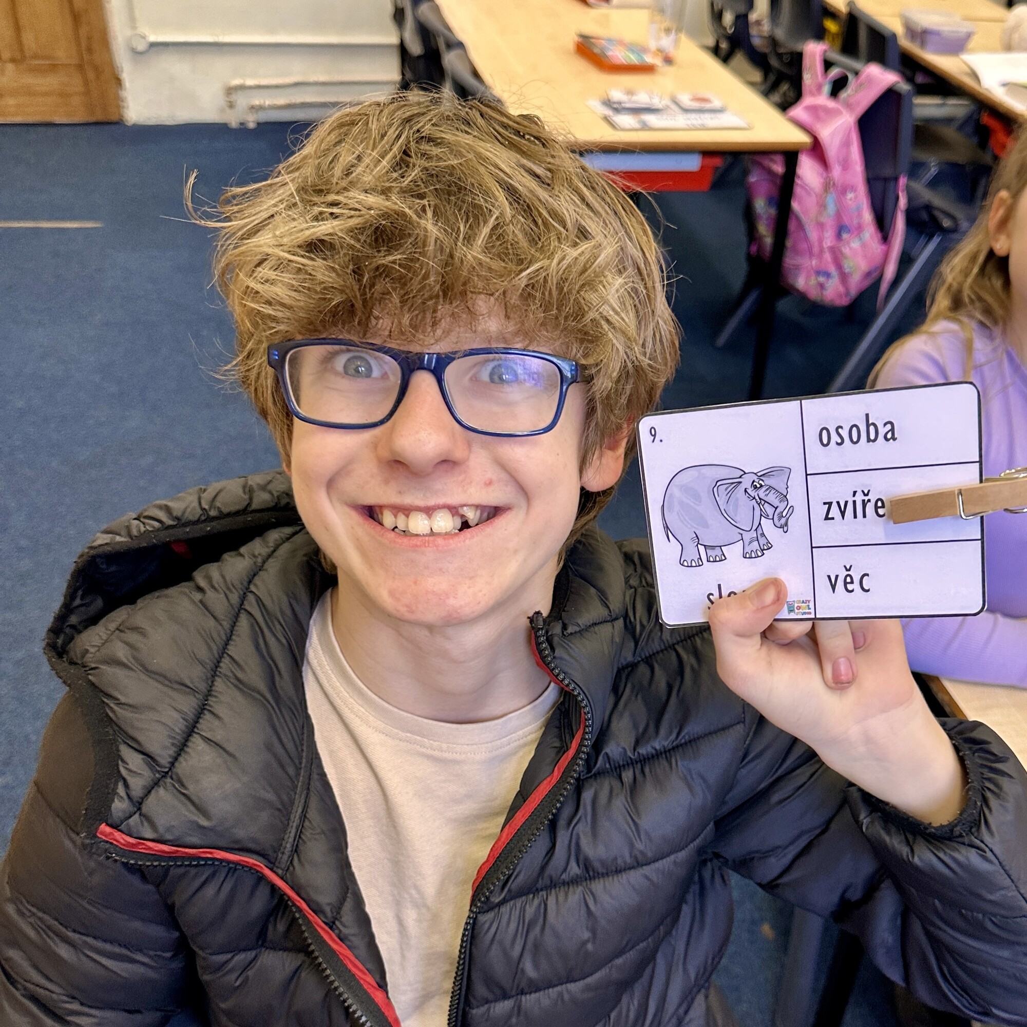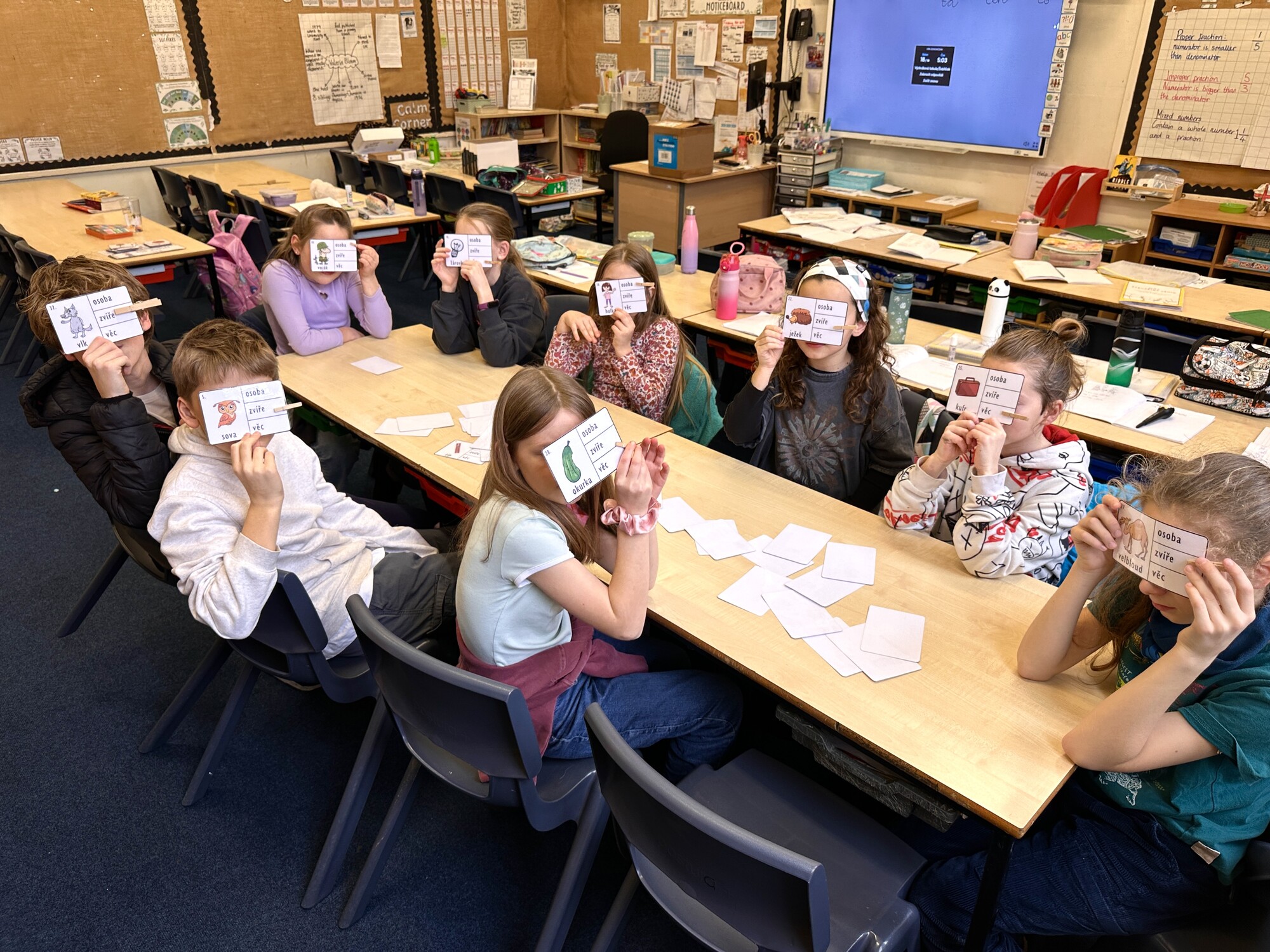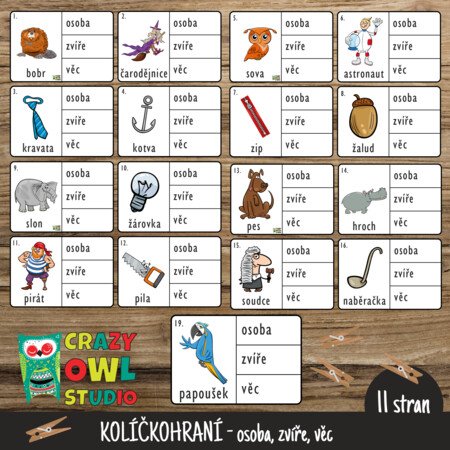 Kolíčkové kartičky k rozlišení podstatných jmen – osoba, zvíře, věc.