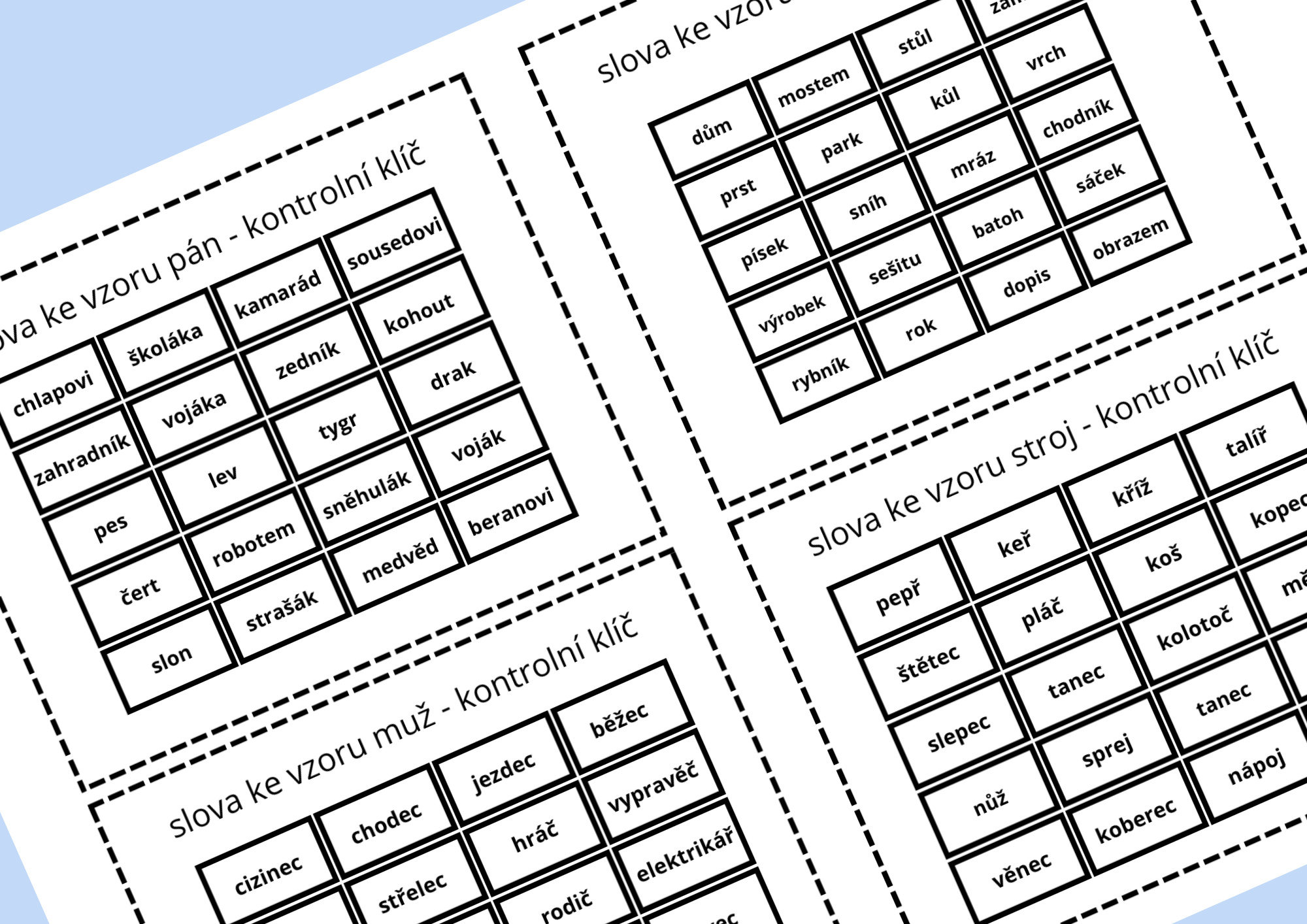 tato didaktická hra je zaměřena na procvičování rozlišování podstatných jmen rodu mužského a jejich přiřazování ke vzorům pán, hrad, muž, stroj, předseda a soudce. Cílem hry je, aby si žáci upevnili porozumění jednotlivým vzorům, naučili se je rozpoznávat pomocí skloňování a dokázali své rozhodnutí jednoduše zdůvodnit. Hra vede děti k vědomé práci s jazykem a potlačuje pouhé tipování.