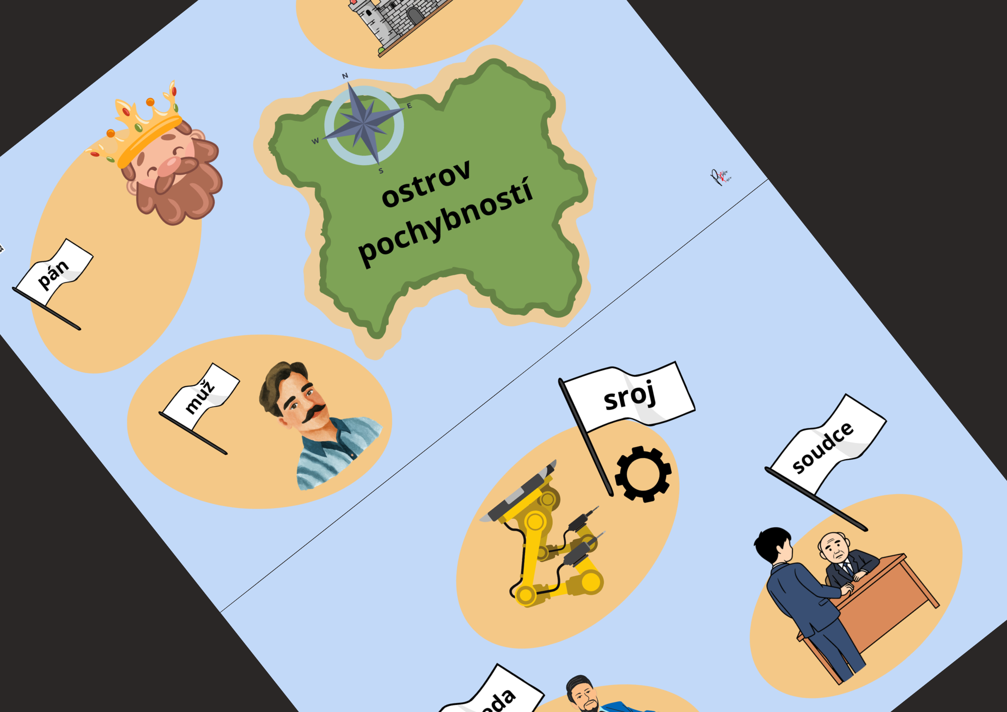 Průběh hry je jednoduchý. Žák si vezme kartičku, přečte slovo a před jeho přiřazením ke vzoru si ho ověří skloňováním, nejčastěji pomocí druhého pádu jednotného čísla (např. bez města, bez kuřete, bez stavení). Teprve poté kartičku položí do odpovídající oblasti herní plochy. Pokud si skupina není jistá, kartičku odloží na ostrov pochybností. Tento krok je záměrný a žádoucí, protože učí děti přiznat nejistotu a pracovat s ní.