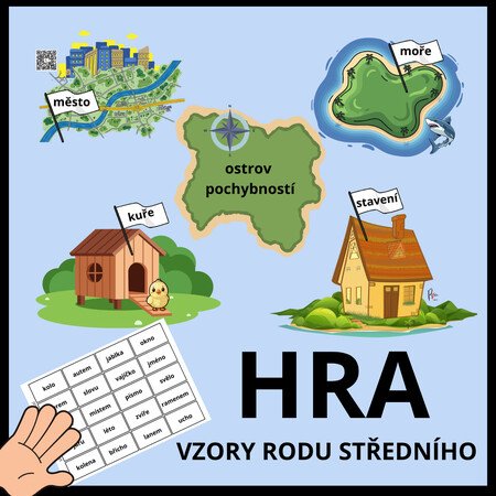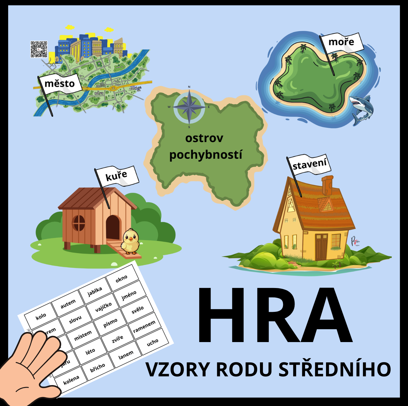 tato didaktická hra je zaměřena na procvičování rozlišování podstatných jmen rodu středního a jejich přiřazování ke vzorům město, moře, kuře a stavení. Cílem hry je, aby si žáci upevnili porozumění jednotlivým vzorům, naučili se je rozpoznávat pomocí skloňování a dokázali své rozhodnutí jednoduše zdůvodnit. Hra vede děti k vědomé práci s jazykem a potlačuje pouhé tipování.