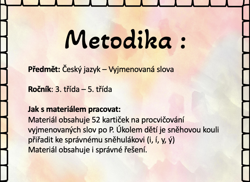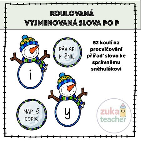 Materiál obsahuje 52 kartiček na procvičování vyjmenovaných slov po P. Úkolem dětí je sněhovou kouli přiřadit ke správnému sněhulákovi (i, í, y, ý)