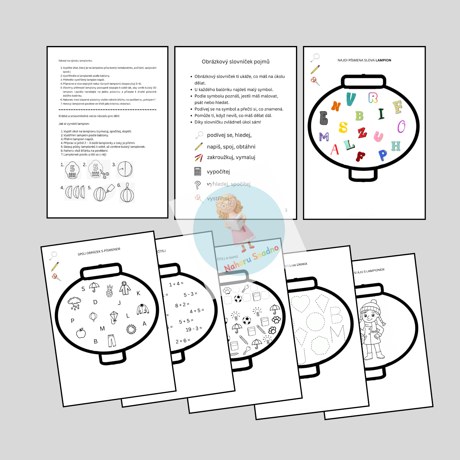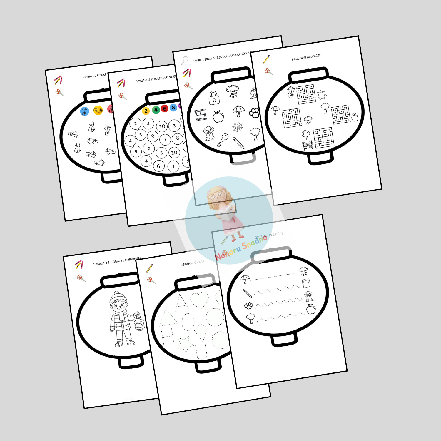 Součástí souboru je sada šablon lampionků – a jak víme, lampionky mají děti vždycky rády! Každý lampionek skrývá jednoduchý úkol: na procvičování pozornosti, orientace na stránce, grafomotoriky až po nácvik čtení, psaní a počtů.