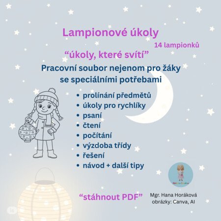 připravila jsem pro Vás inspirativní pracovní soubor, který potěší Vaše žáky a podpoří jejich tvořivost i rozvoj dovedností. Tento materiál vznikl především s ohledem na potřeby žáků se speciálními vzdělávacími potřebami, ale jistě zaujme všechny mladšího školního věku. Lampionky mohou sloužit jako tvořivé opakování po prázdninách, nastartování dalších vyučovacích aktivit nebo jako úkol pro rychlíky, kteří už mají vše hotovo.