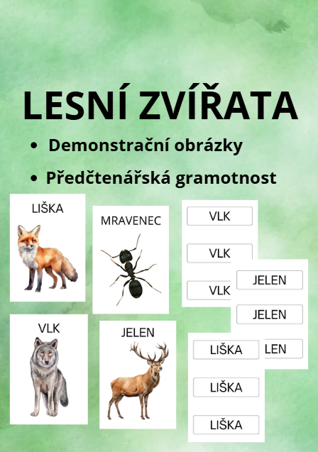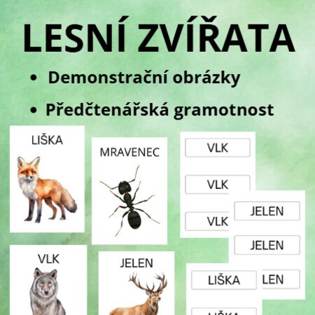 17 demonstračních obrázků s pozadím/bez pozadí: zajíc, vlk, liška, medvěd, jelen, srnka, veverka, divočák, puštík, jezevec, ježek, žába, strakapoud, bažant, můra, mravenec, roháč. 51 kartiček s názvy zvířat