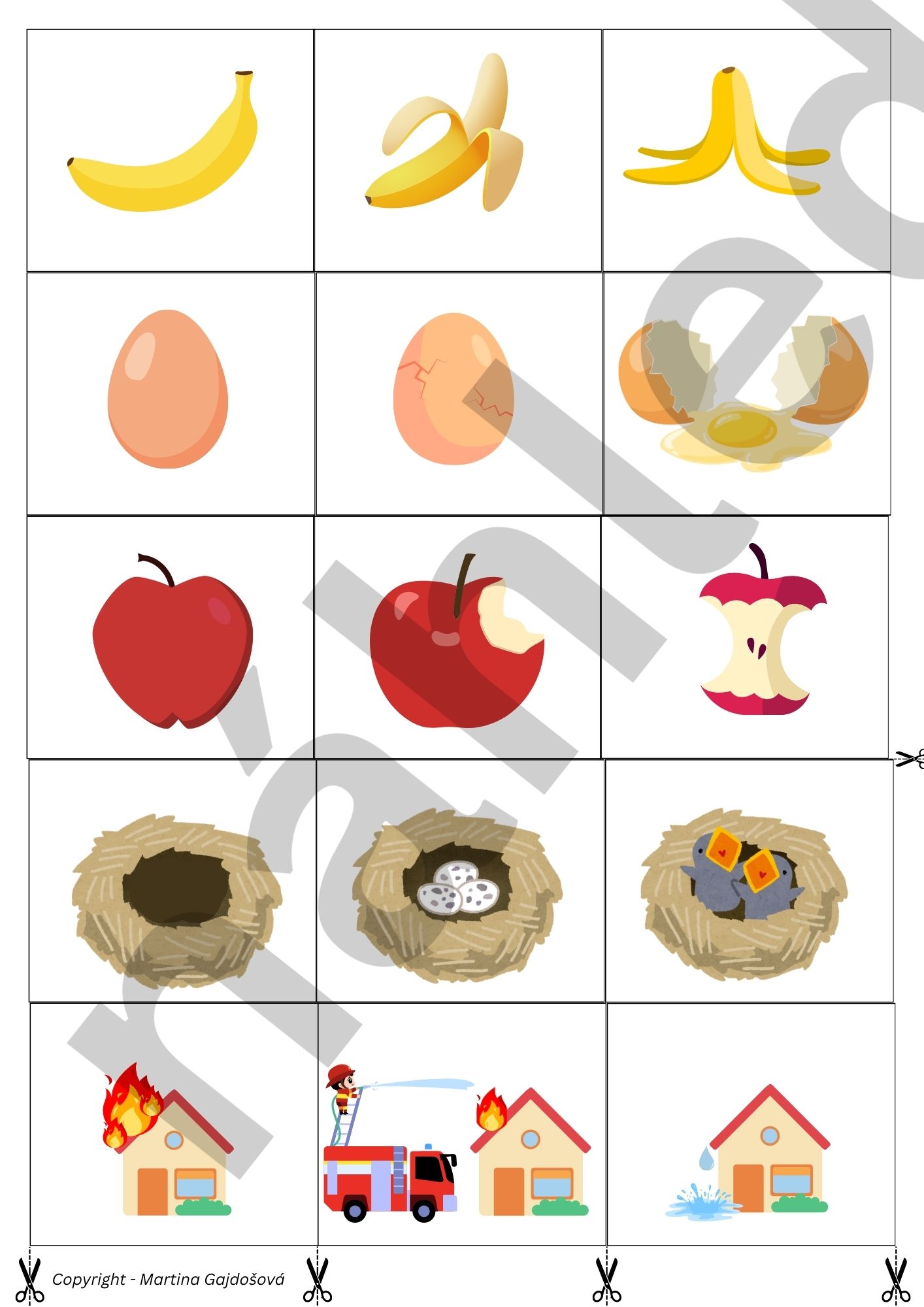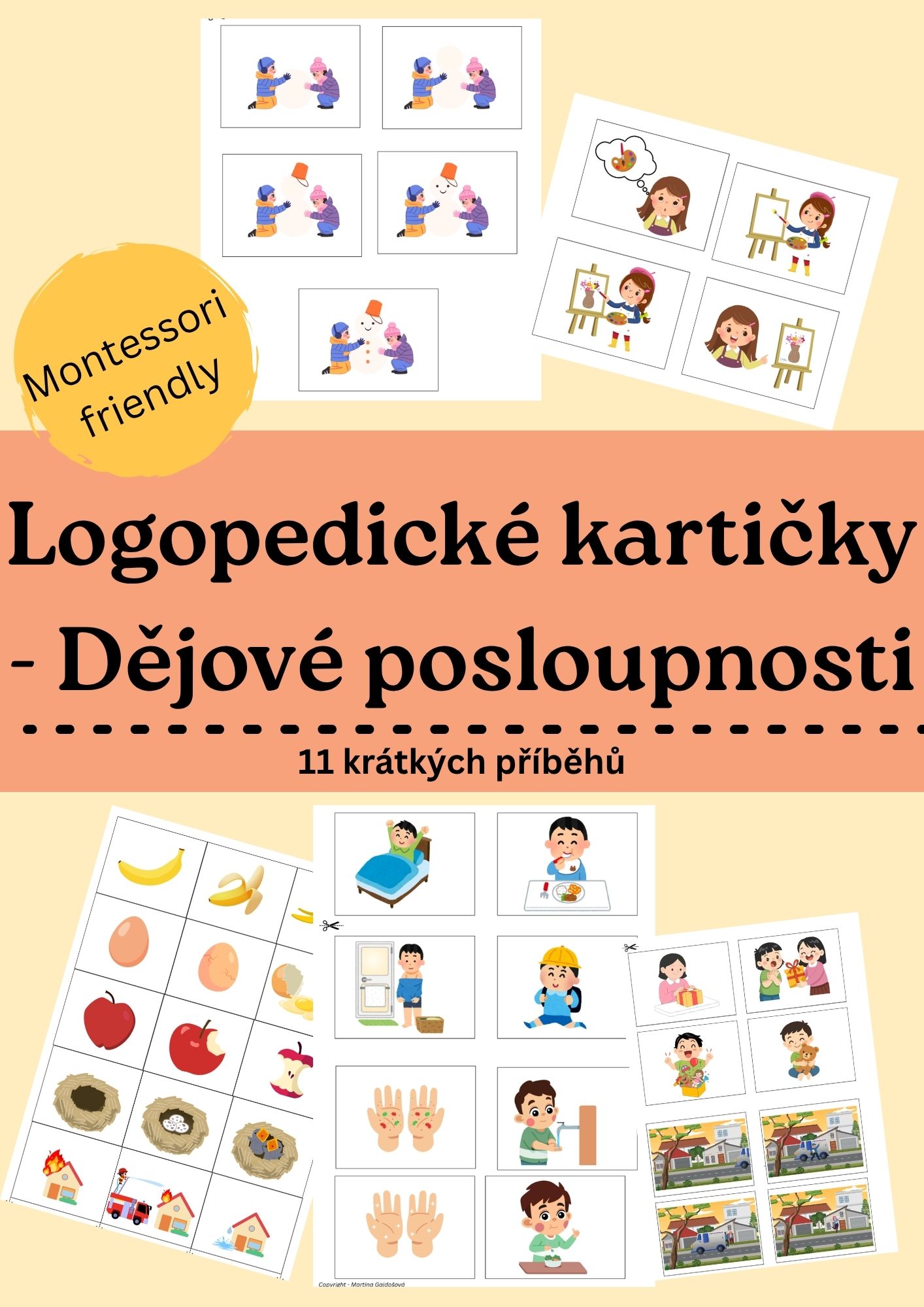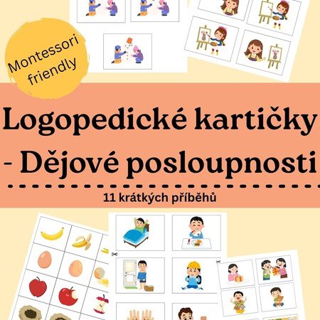 Soubor 11 jednoduchých dějových posloupností, od jednoduchých (3 části) po složitější (5 částí)