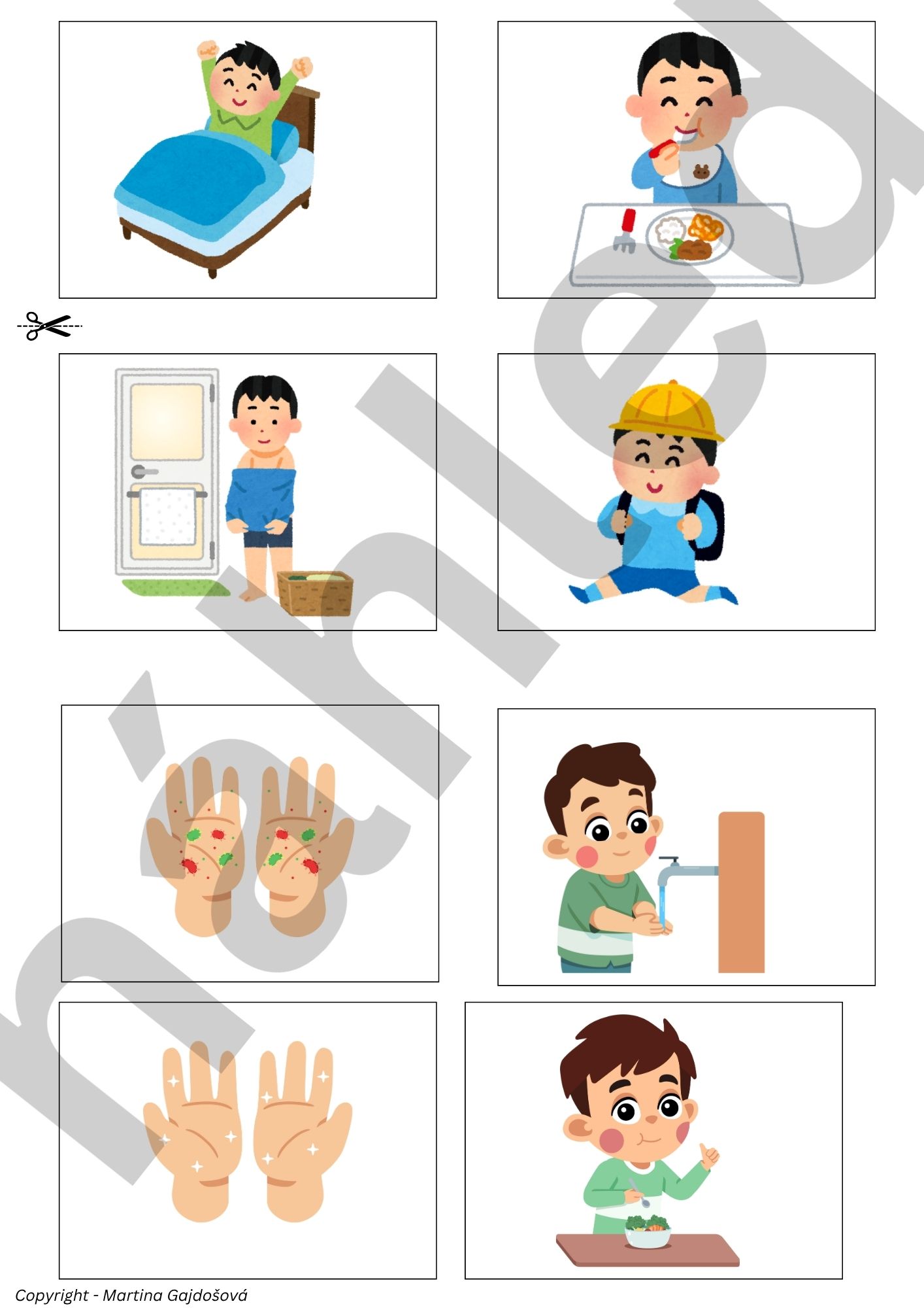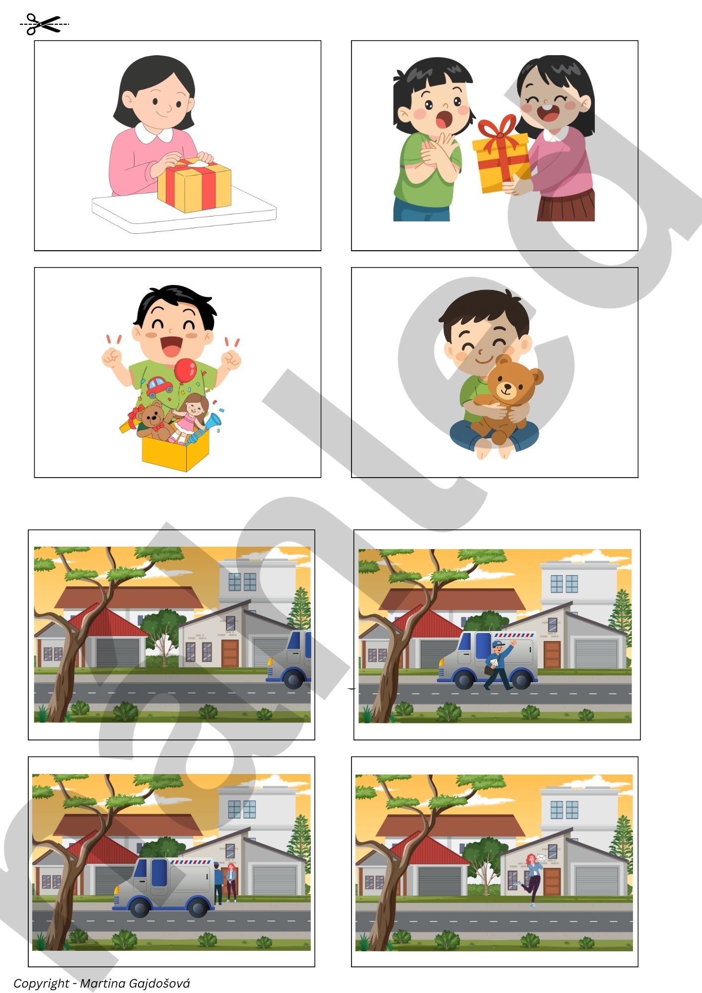 Děti mají za úkol seřadit obrázky tak jak jdou za sebou a vyprávět, co se na obrázcích děje. Vyprávění příběhu rozvíjí plynulost řeči a slovní zásobu.
