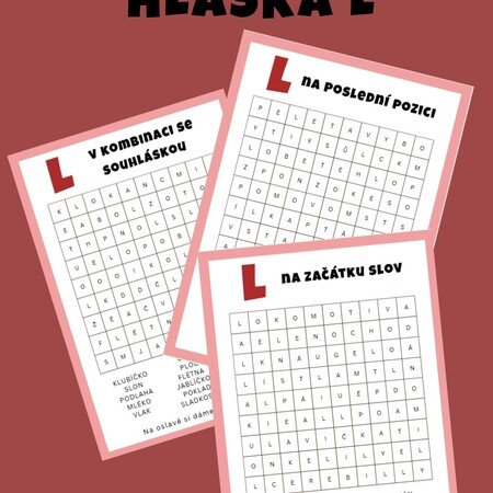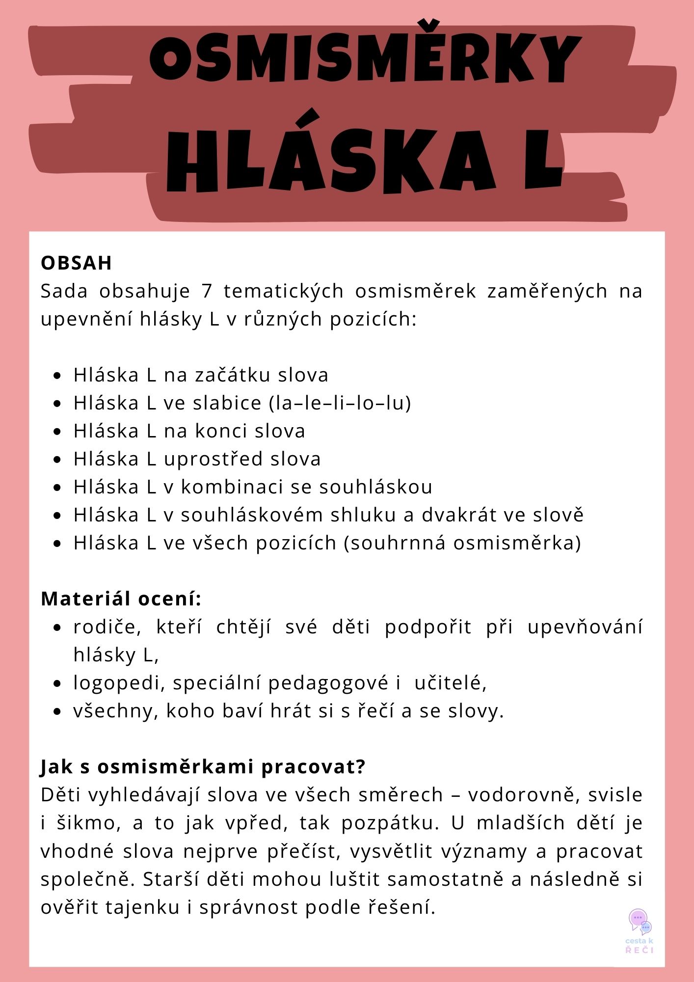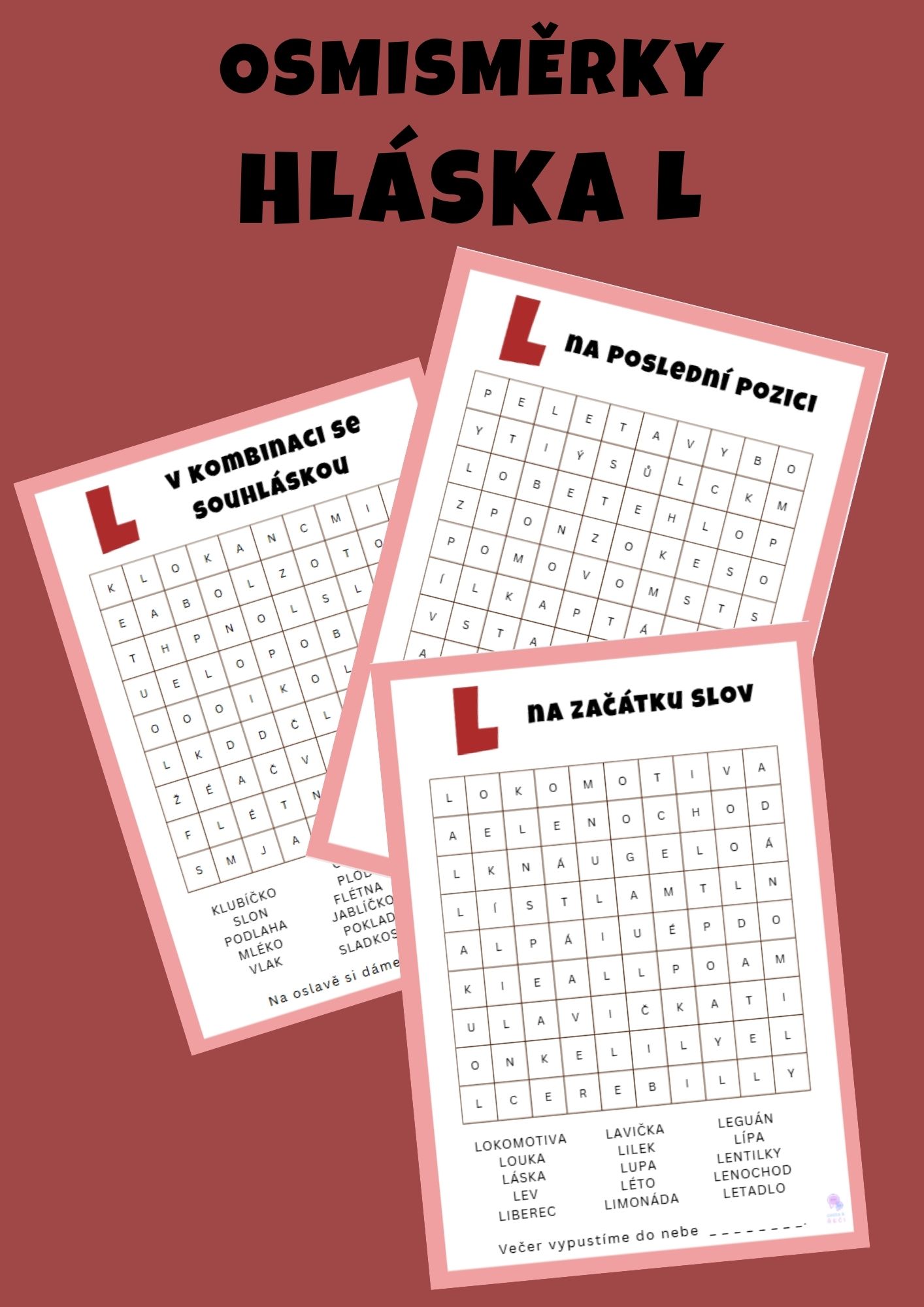 Sada 7 logopedických osmisměrek zaměřených na upevnění a automatizaci hlásky L v různých pozicích slova. Materiál je určen pro děti, které už mají výslovnost hlásky L správně zafixovanou a potřebují ji dále trénovat v řeči, čtení a slovní zásobě. Osmisměrky lze využít doma, na logopedii, ve škole, v družině i jako zábavnou aktivitu pro děti, které rády luští.
